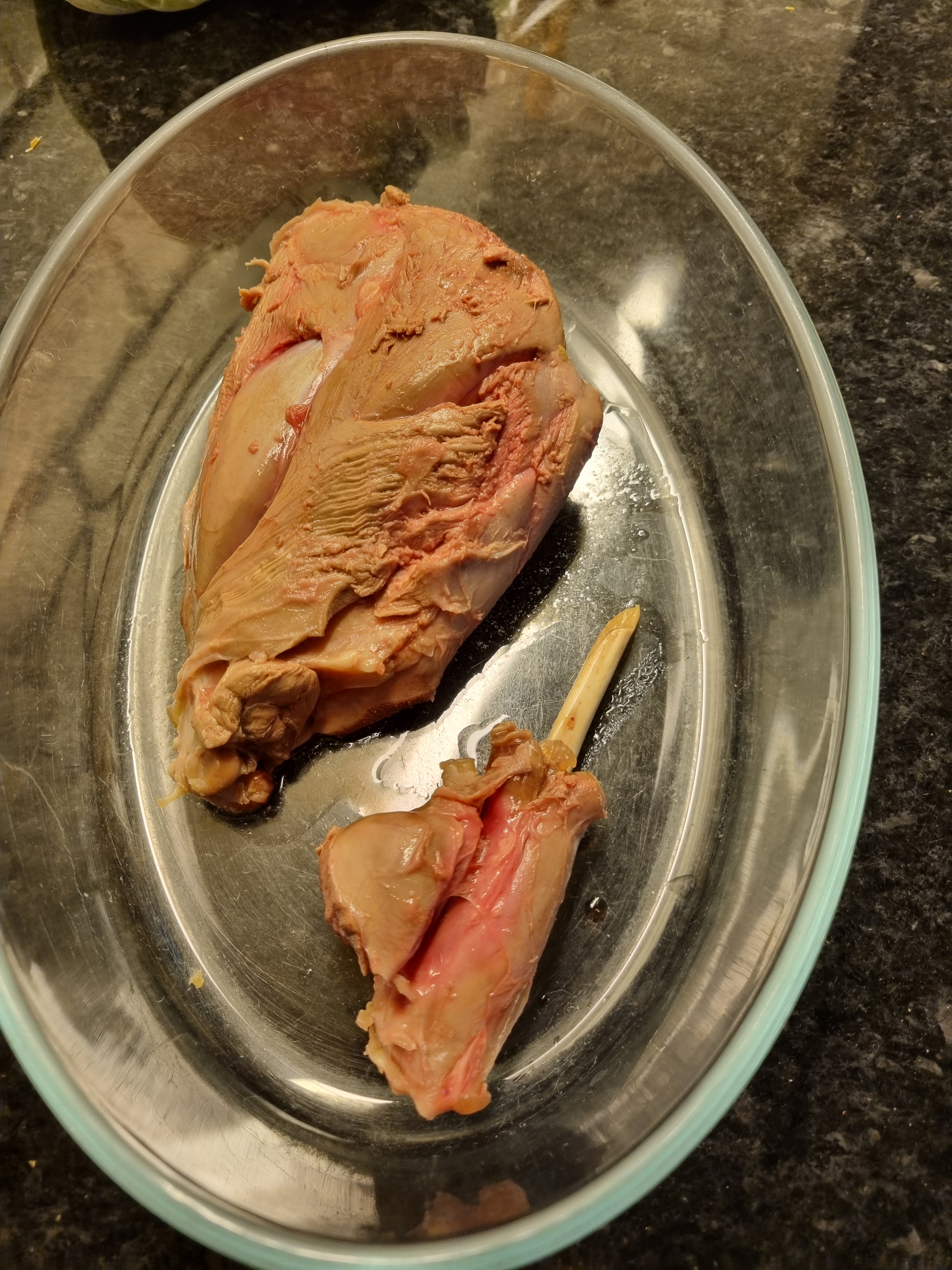 • Vi använde lår och framben med benet kvar (det lossnar lätt när köttet är stekt) men skar bort de hinnor vi kom åt