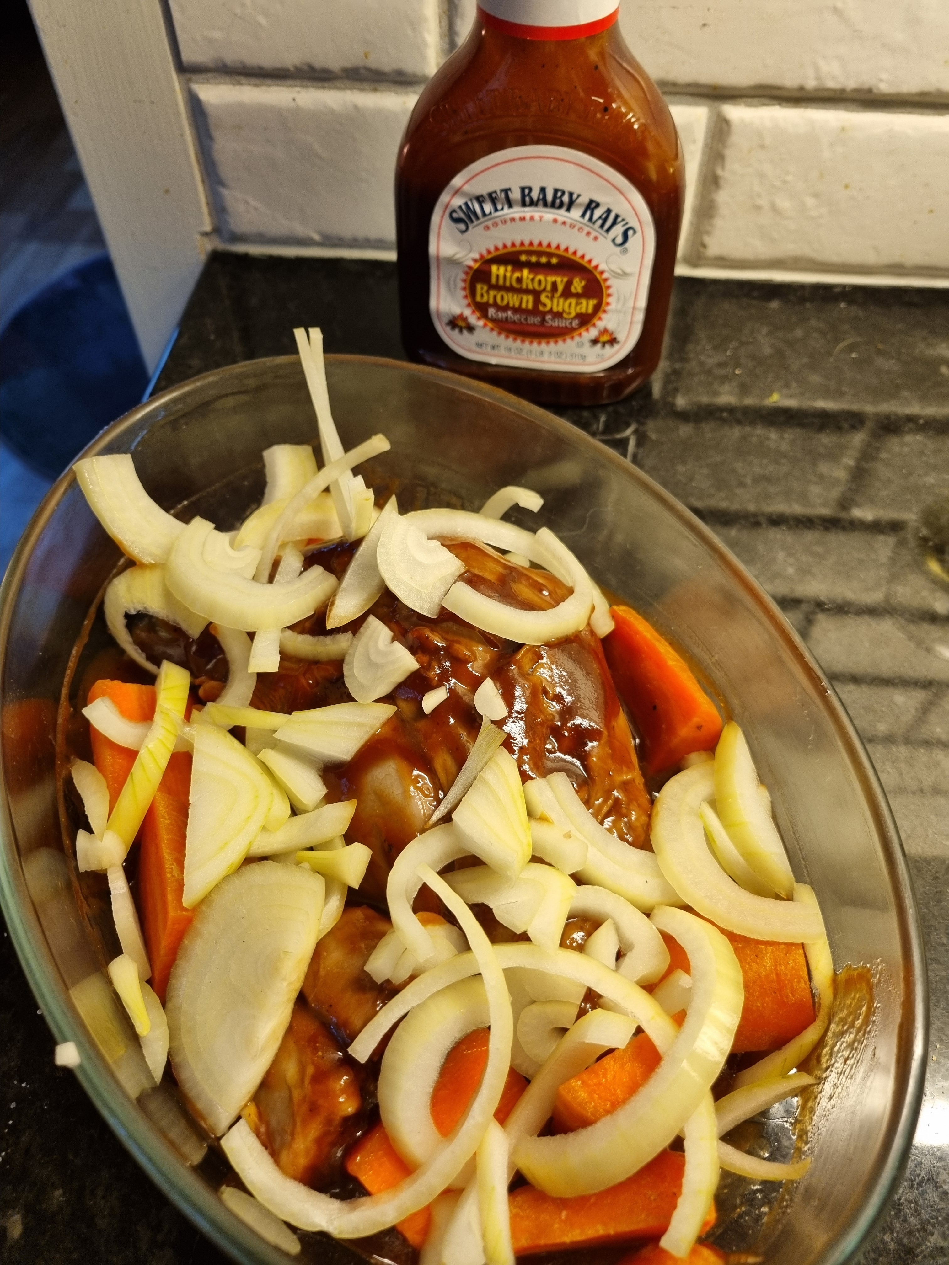 • Sen använde vi Sweet Baby Ray’s Bbq-sås men det går bra med vilket märke som helst. Hällde på knappt halva flaskan och gnuggade in det ordentligt