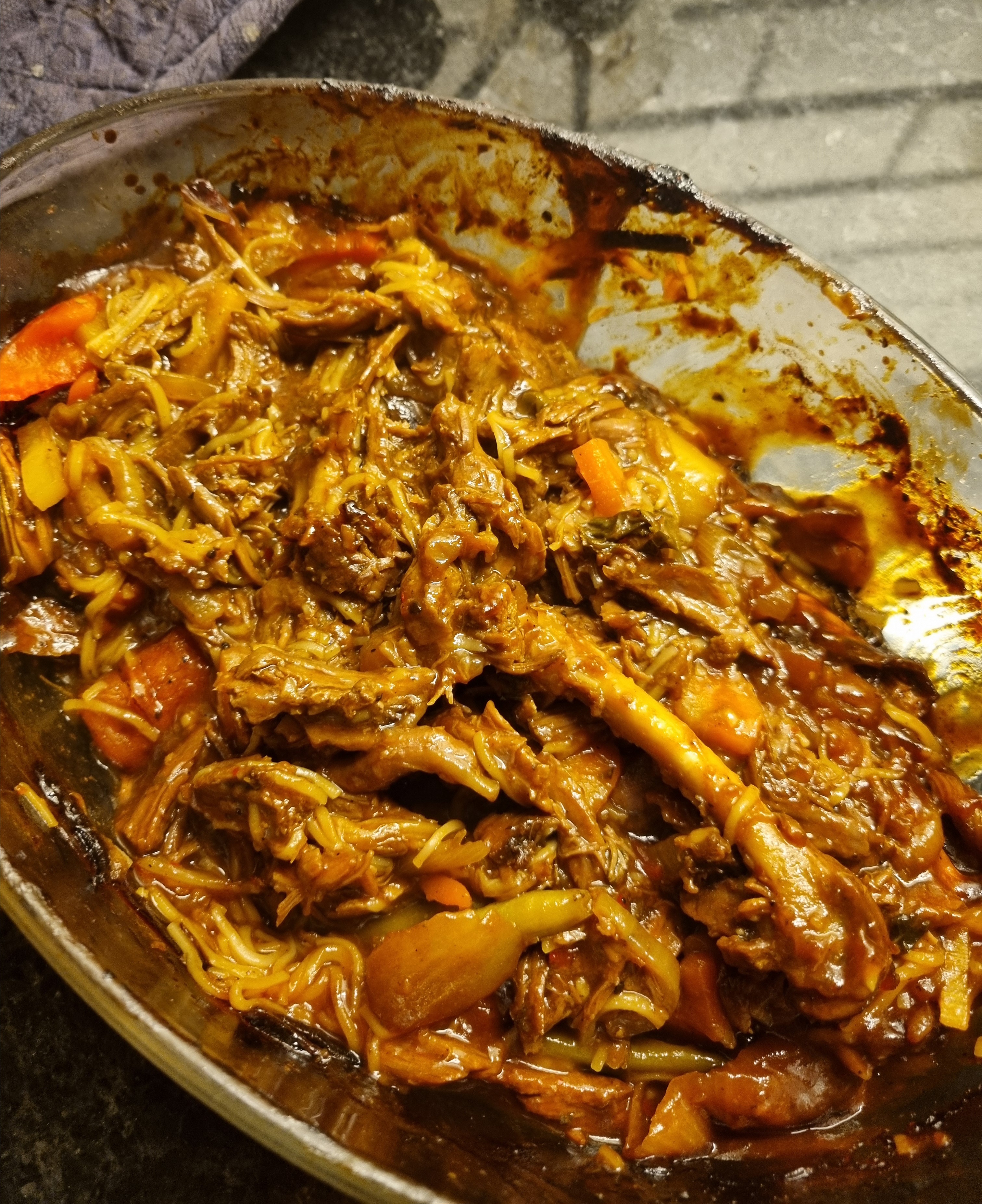 • Sen fick den stå i ugnen i 165 grader i 5-6 timmar. Värmen kan variera mellan olika ugnar och storlek och kvalitet på köttdelarna så titta till det då och då under tiden. Efter ett par timmar kan man se om man kan börja dra isär det något med gafflar