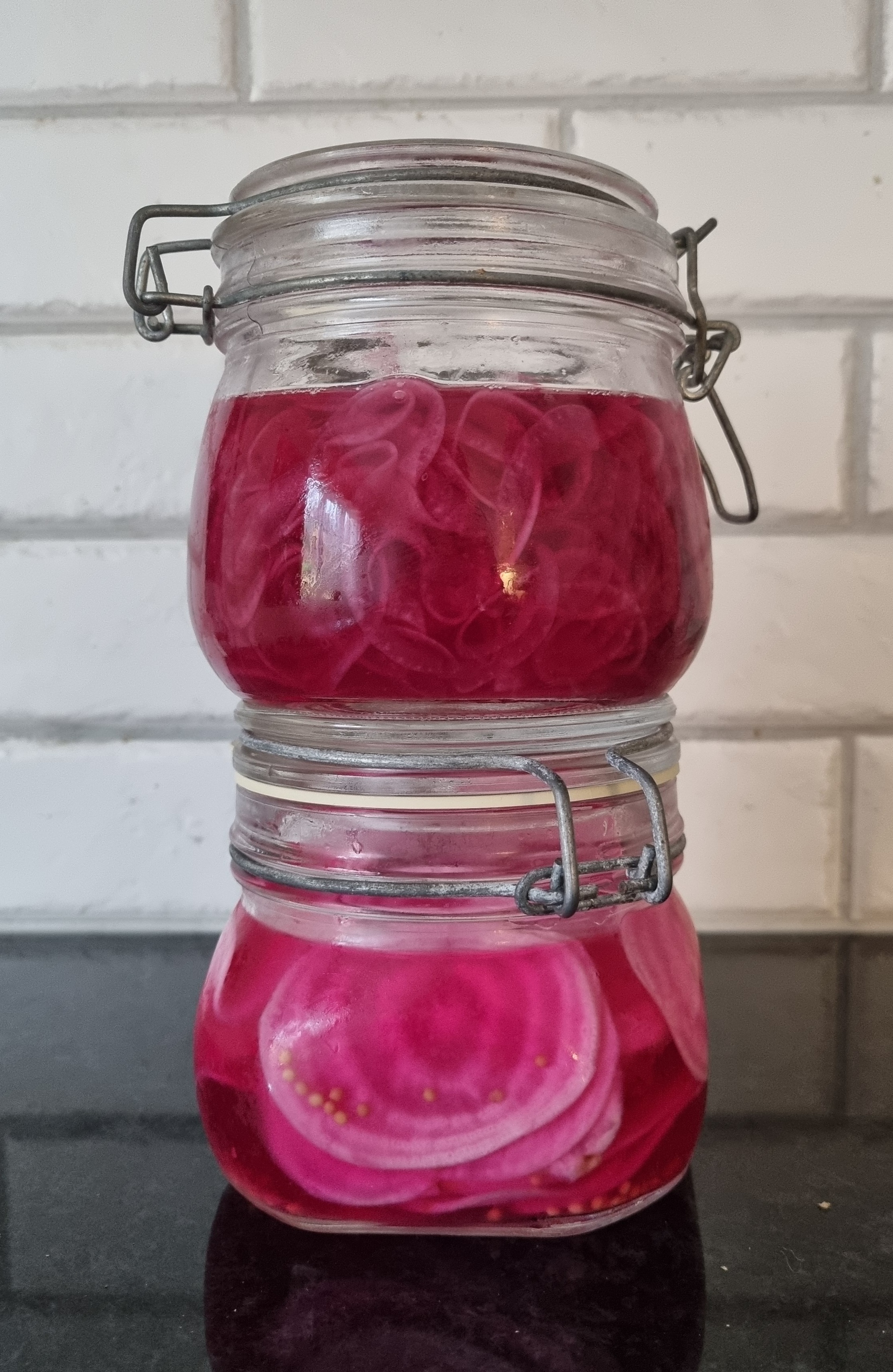 Denna gången gjorde jag två lagar – en räckte till ungefär 4-5 rödlökar som jag skivat tunt på mandolin. I den kokade jag också med ett lagerblad och två stycken stjärnanis.