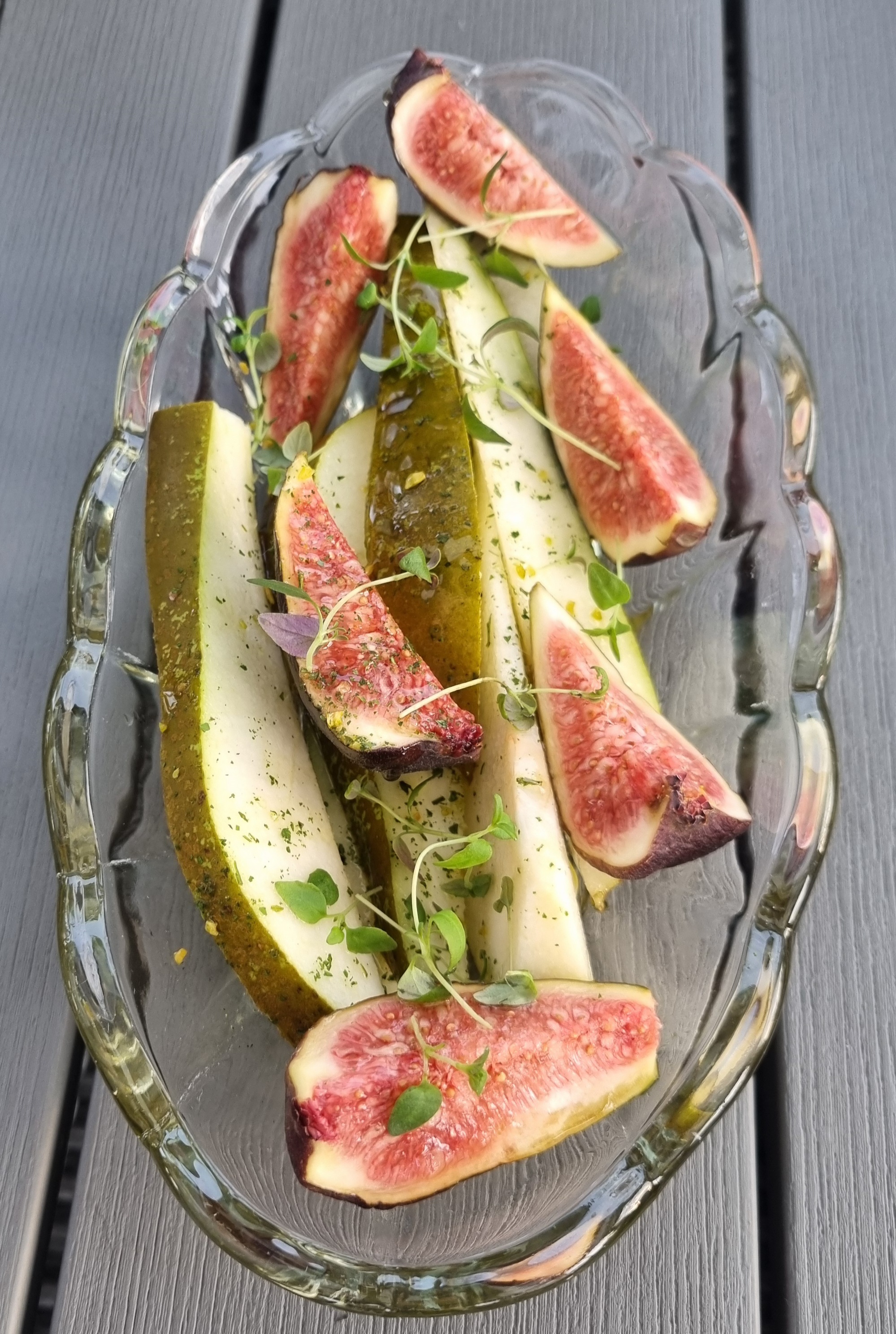 2. Dela fikonen på längden och lägg upp päron och fikon på en tallrik