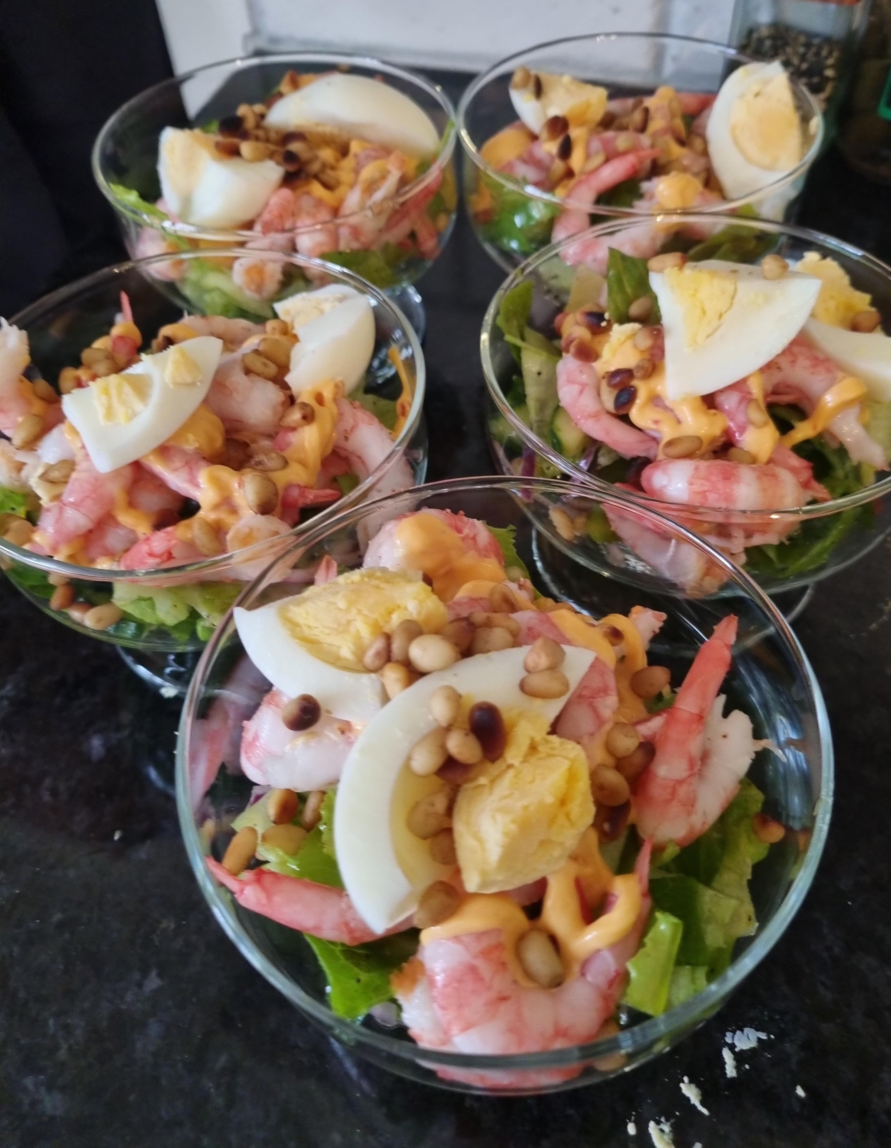 • På det räkor, äggklyftor och torrostade pinjenötter.
