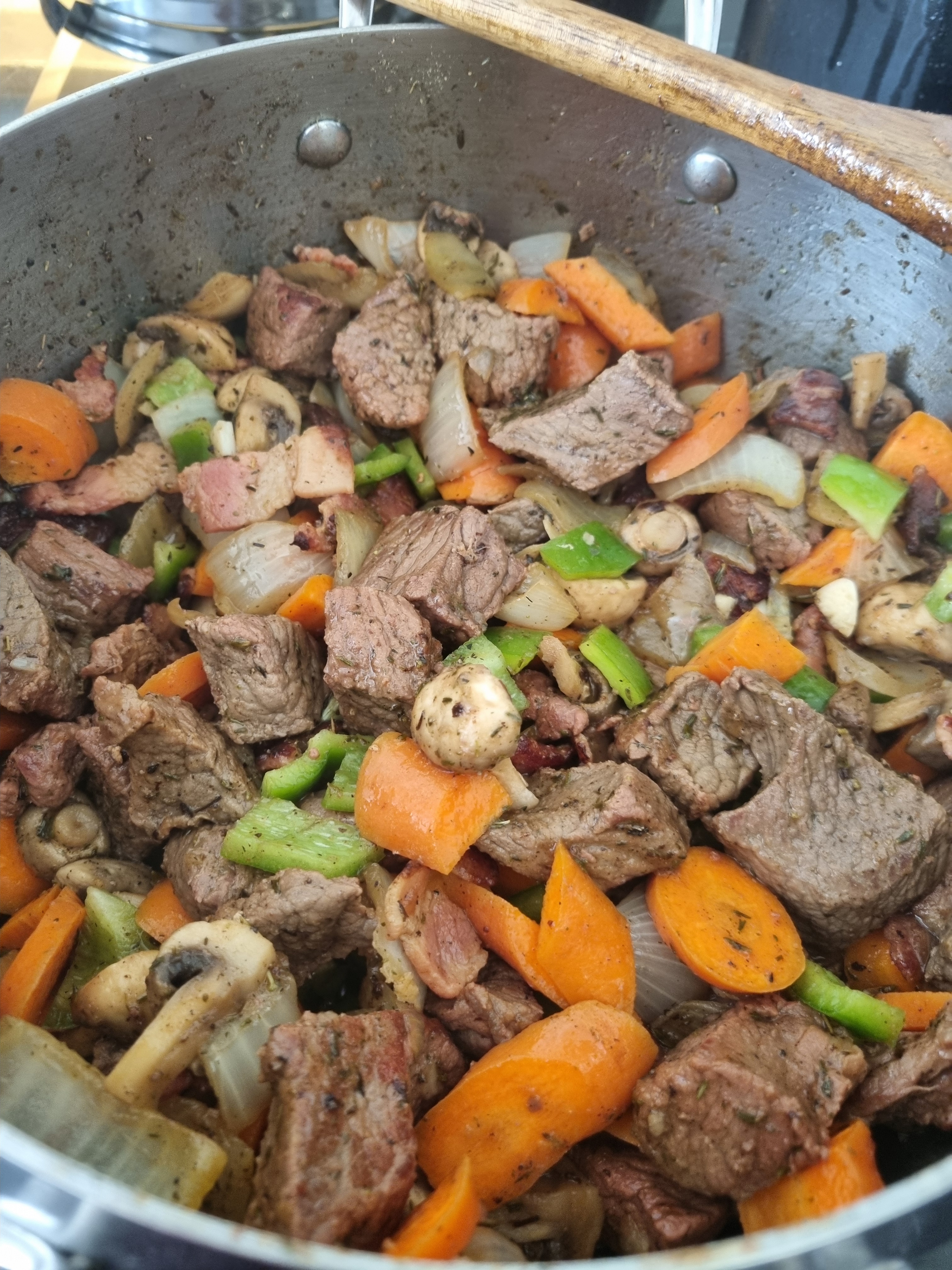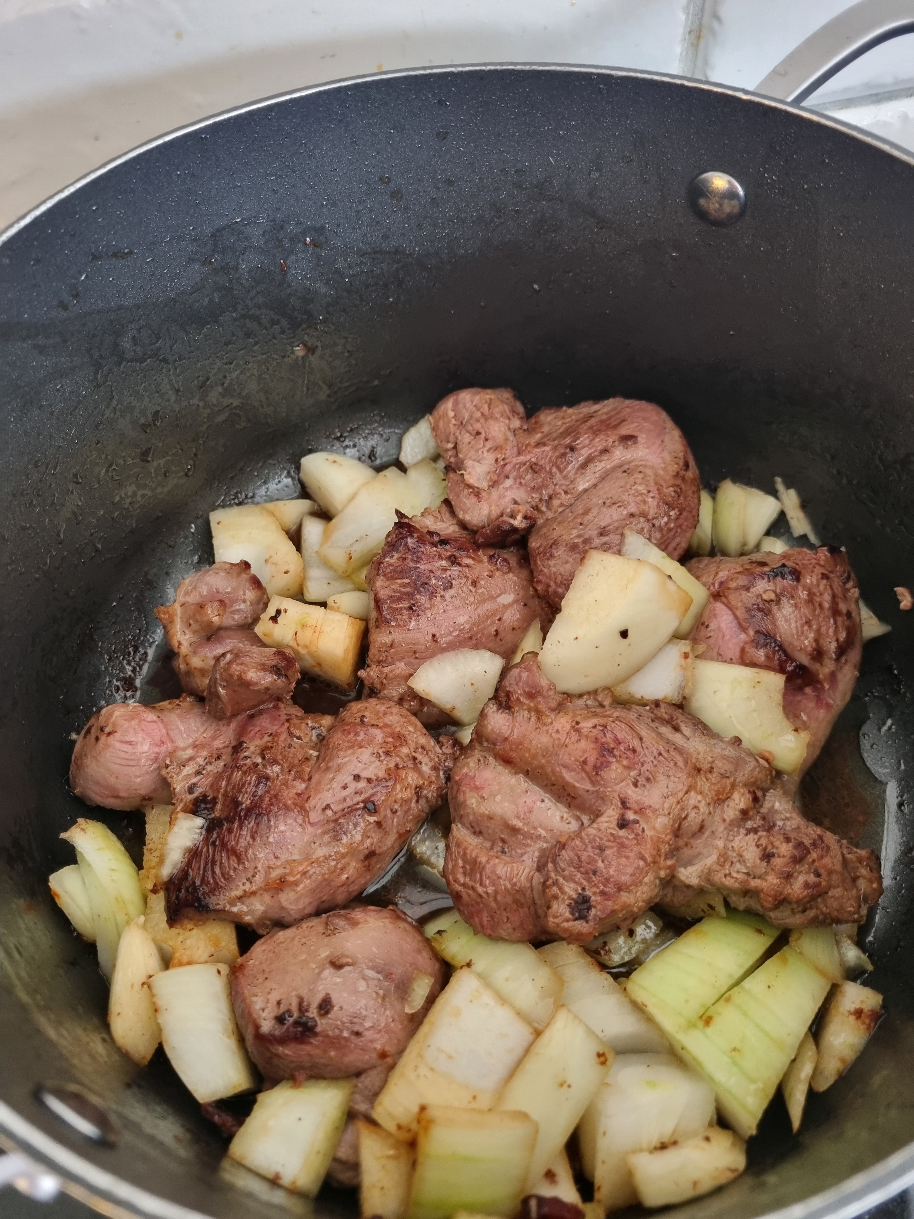 • Lägg nu allt det brynta: kött, fläsk, lök, vitlök, paprika, morötter och champinjoner i en stor gryta