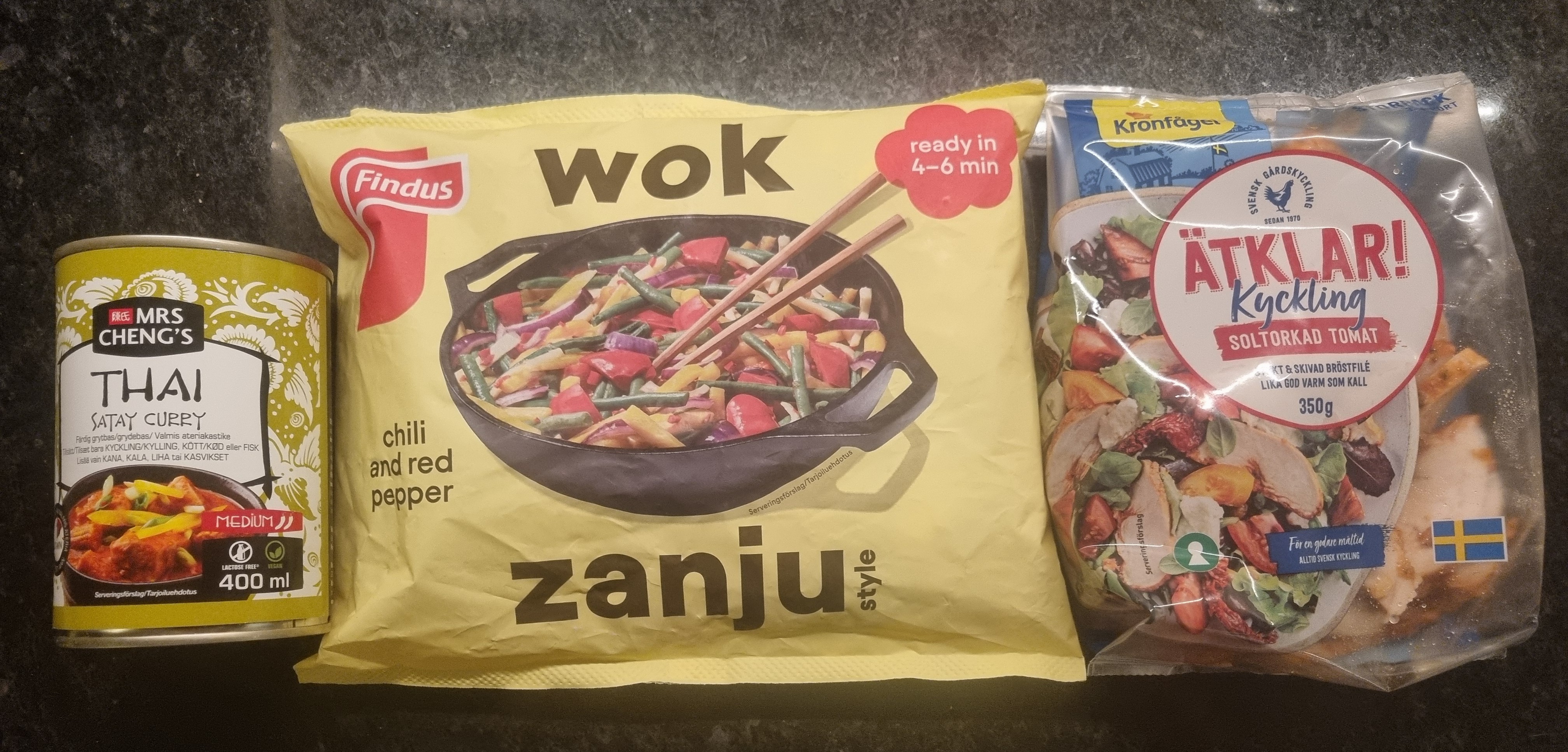 Japp, så enkelt kan det vara. Anlita Mrs Cheng som har kokat goda såser, en påse wokgrönsaker och färdigstekt kyckling. Jag gillar Zanjo wokgrönsaker med chili och red pepper men det går bra med vilka wokgrönsaker som helst.