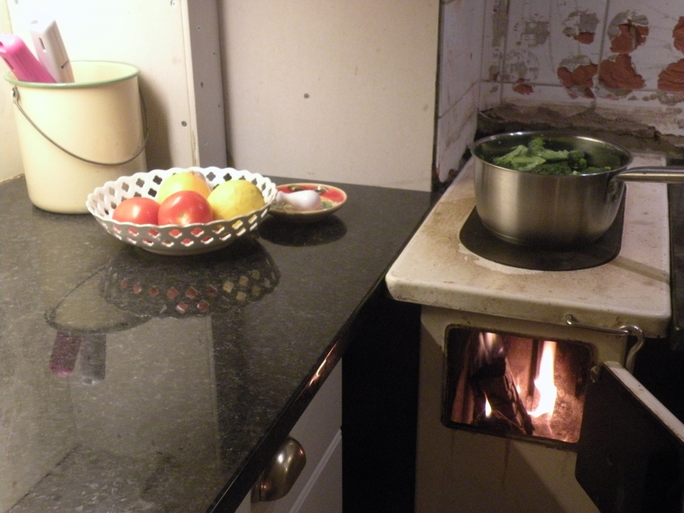 När snön yr utanför så är det mysigt att tända en eld i den lilla vedspisen i köket! Och ännu mysigare blir det när man kan passa på att laga lite mat samtidigt. Det känns som att maten blir lite godare men det är nog bara inbillning, kan jag tro. I varje fall så blir det en riktig go’ värme i köket och så luktar det gott och hemtrevligt!
