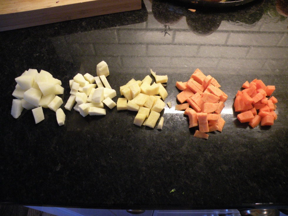 Rotfrukts-pytt. Jag gillar rotfrukter! Det är så roligt och fascinerande med färgerna som varierar från vitaste vitt till djupaste rött. Rödbetorna missade jag att köpa idag men de får vara med nästa gång. Jag valde att göra pytten av potatis, palsternacka, kålrot, sötpotatis och morot. Sen lade jag till rödlök också för det lyfter alltid upp smaken till högre höjder. Kolla in färgtonerna nedan.