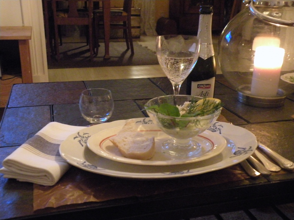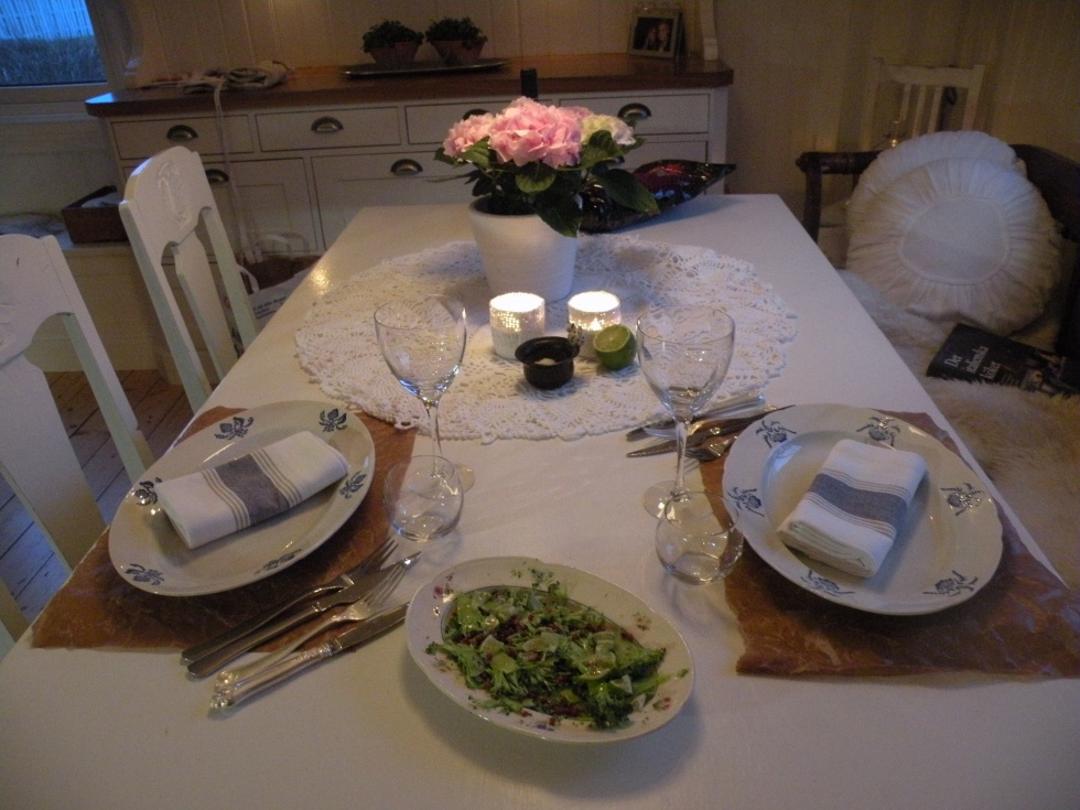 Tyvärr så valde kamerans batteri att tvärdö så jag fick inga bilder på den goda huvudrätten, men jag hann ändå att plåta den fina dukningen och den goda salladen som serverades till. Den bestod av broccoli, sallad, lime och rosépeppar och var en frisk och varm fläkt till pytten och det fina köttet som var ekologiskt och svenskt. Bra val, Karlsson!