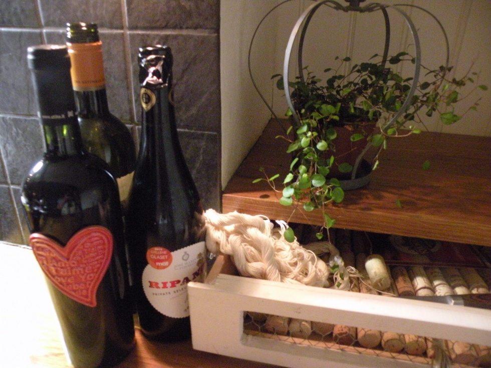 Efter maten tittade vi på Let´s Dance och mumsade på några riktigt goda chokladpraliner med kokospuder och flingsalt. Gött ska’t va på fredakwällen! 🙂 Och jodå, vi hann med lite vin också. En av flaskorna nedan var min födelsedagspresent så den fick åka med hem till Varberg idag, (den med ett rött keramikhjärta), men de andra två njöt vi av vid matlagningen, till köttet och till den mörka, goda chokladen.