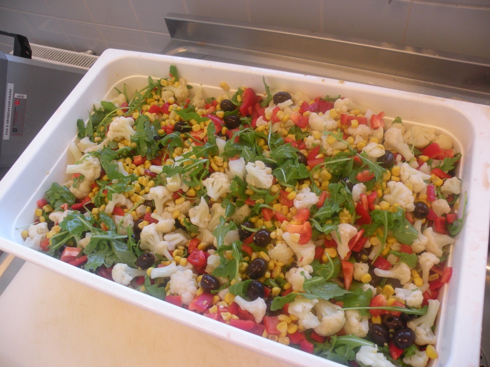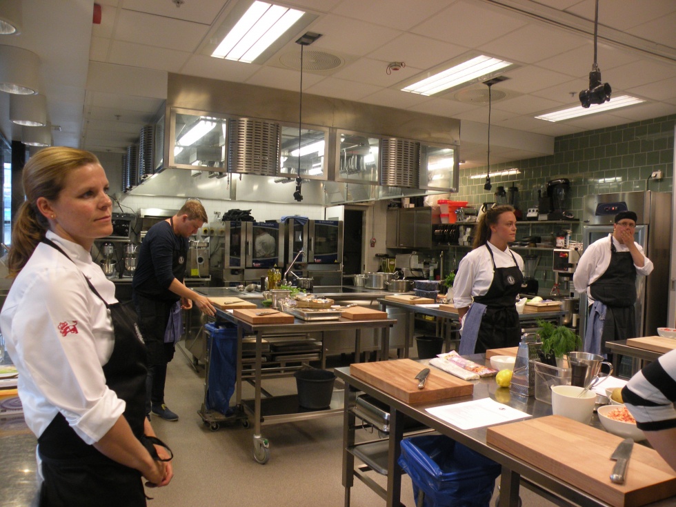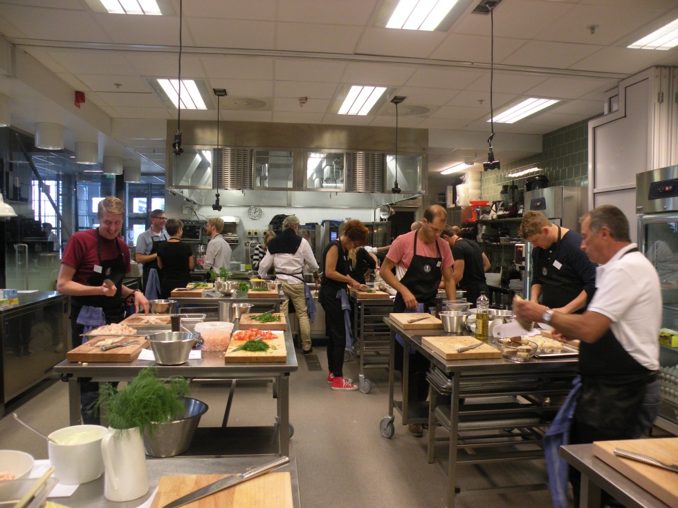 Medan vi kursdeltagare minglade och hade det trevligt på rasten så hade kursledarna och deras assistenter fullt upp med arbete. De preparerade det fina och fräscha köket inför eftermiddagens äventyr! Efter någon halvtimmas rast så steg vi in i köket igen, vi blev guidade runt på de olika stationerna och fick veta vad som skulle tillagas och hur vi skulle gå till väga och sen var det bara att börja jobba igen.