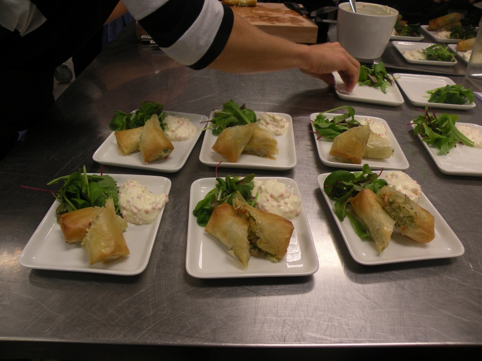 Nu startade arbetet med att skapa en massa goda fisk- och skaldjurs-rätter som vi skulle få avsmaka under förmiddagen. Jag stod på en station där vi gjorde en kräftröra som vi rullade in i en filodeg och sen stekte i ugn och serverade med salladsblad och en sås av creme fraiche och löjrom.