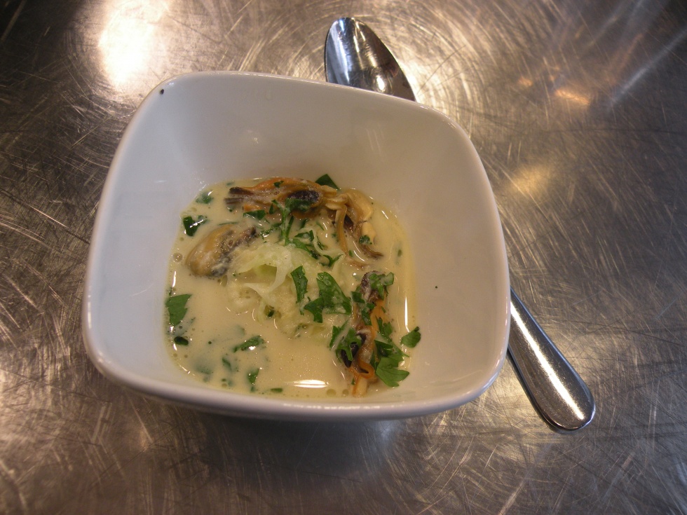 Blåmusselsoppa med marinerad fänkål. Den var fantastiskt god och smakrik! En riktigt bra avslutning på förmiddagens gourmetiska resa. Vi behövde definitivt ingen lunch när rasten kom men det var gott med kaffe och lite frisk luft. Till och solen ville vara med på ett hörn.