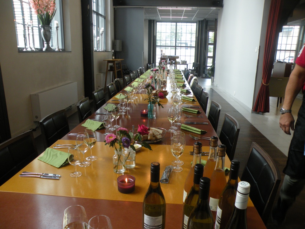 Under förmiddagen åt vi alla rätter på stående fot, minglandes runt i köket och under eftermiddagen avnjöt vi de första rätterna på samma sätt och sen hade vi en trevlig sittning med flera rätter och några goda viner för de som ville. Det ville de flesta. Så här vackert var bordet dukat.