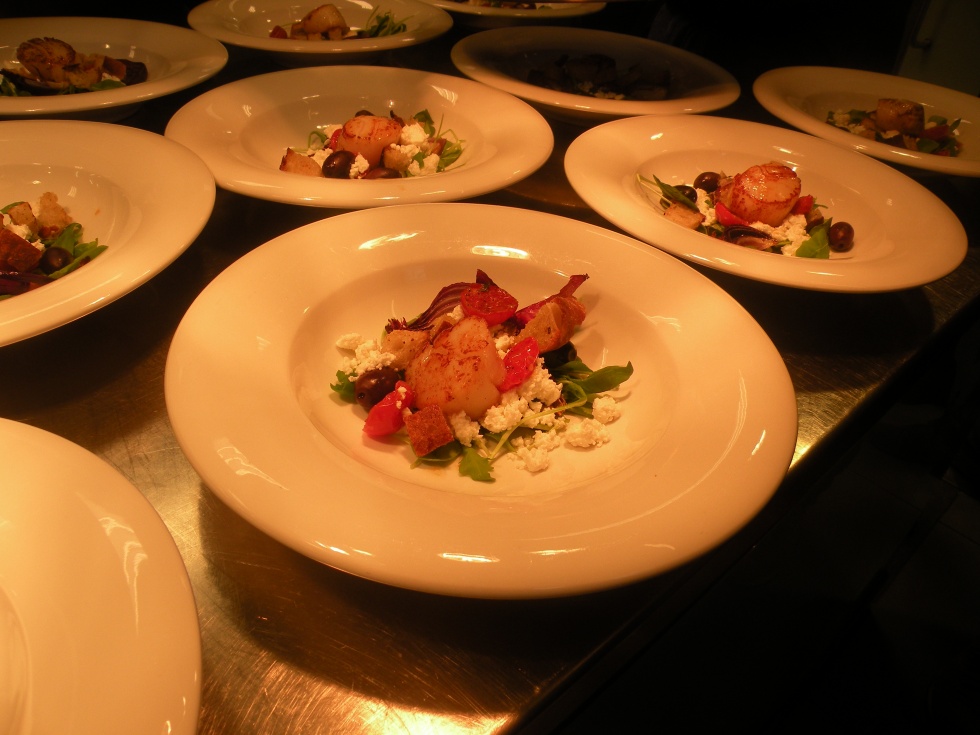 Väl sittandes vid bordet presenteras en Sallad Kythira med Pilgrimsmusslor. En variant på grekisk sallad med en god Pilgrimsmussla på toppen.