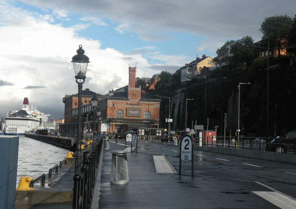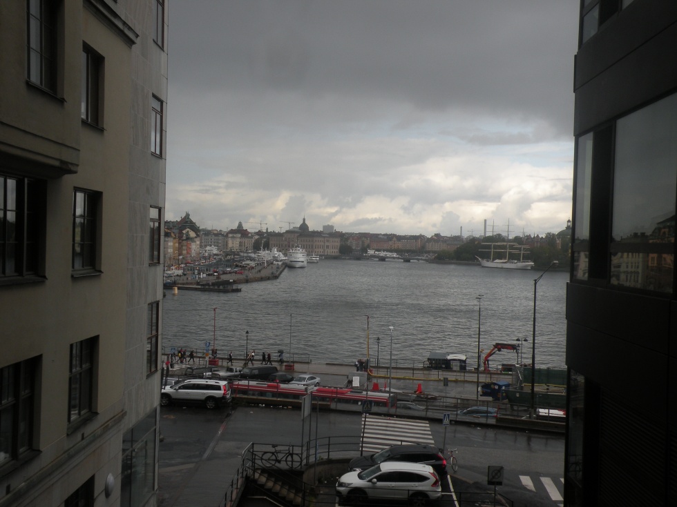 SJ hade hittat på lite nya tågtider, vilket inte är helt ovanligt, så jag kom till Stockholm fyra timmar senare än beräknat. Regnmolnen hade hunnit lägga ett lock över stan men med paraply så traskade jag i alla fall från Slussen till Fotografiska. Denna vackra men lite gråa vy fick jag se mellan husen på vägen till mitt mål.