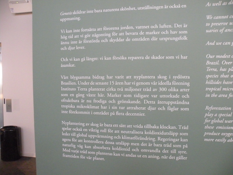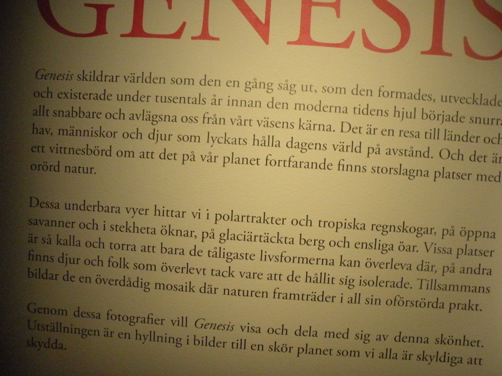 ”Sebastião Salgado är en av vår tids mest respekterade bildjournalister. I över fyrtio år har han dokumenterat människans villkor. Hans senaste verk Genesis är en åtta år lång resa till platser och människor som hittills har undgått att påverkas av den moderna civilisationen. Utställningen är designad och curerad av Lélia Wanick Salgado och är Salgados kärleksbrev till vår planet, en hyllning till vårt ursprung och en påminnelse om vad vi har att förvalta.”