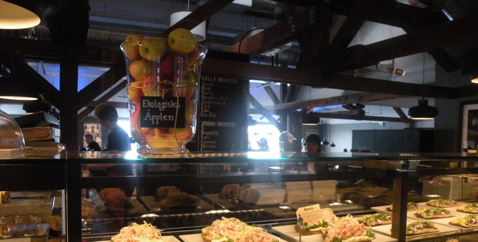 När jag besöker Fotografiska måste jag ju bara ta en titt in i Restaurangen, jag hade tänkt att äta här denna fredag men eftersom tåget rullade in i Stockholm fyra timmar senare än beräknat så blev det lite ändringar i schemat. Jag nöjde mig denna dag med att kika in, titta på den regniga utsikten och på allt gott som fanns att köpa.