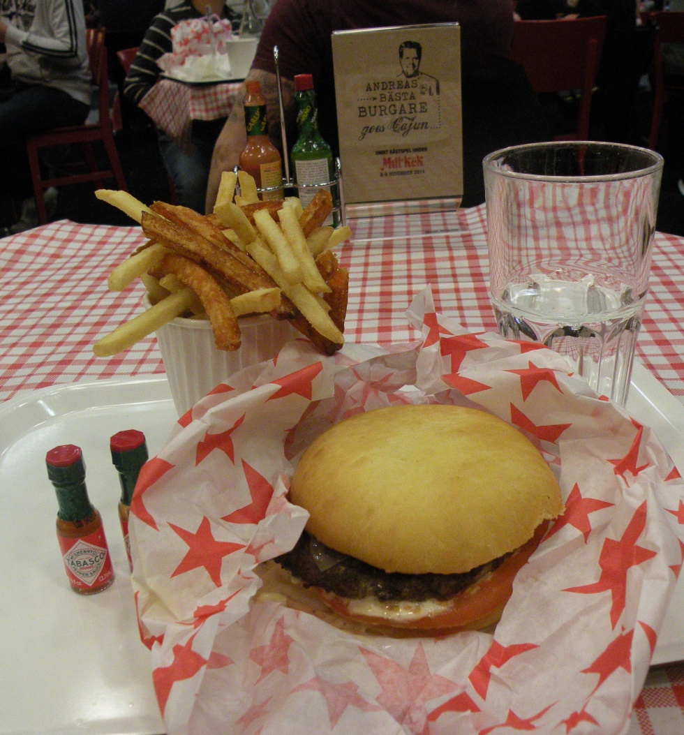Vi minglade runt och avsmakade några viner. Vi provsmakade några smårätter. Vi kände oss lite småhungriga och gick till en av mässrestaurangerna och tog oss något att äta. Henrik hade varit sugen på burgare sen gårdagens besök på #Yolo, där han fick syn på, och inte kunde släppa, en liten god burgare. Vi skulle snart landa på #Restaurang Volt så vi höll oss ändå sparsmakade. Jag tog pommes med dip, de var härligt frasiga och varma direkt från fritösen och de var extra goda eftersom det var en och annan sötpotatisstrimla bland potatisen. Henrik klarade med galans en mästarburgarare Andreas-style