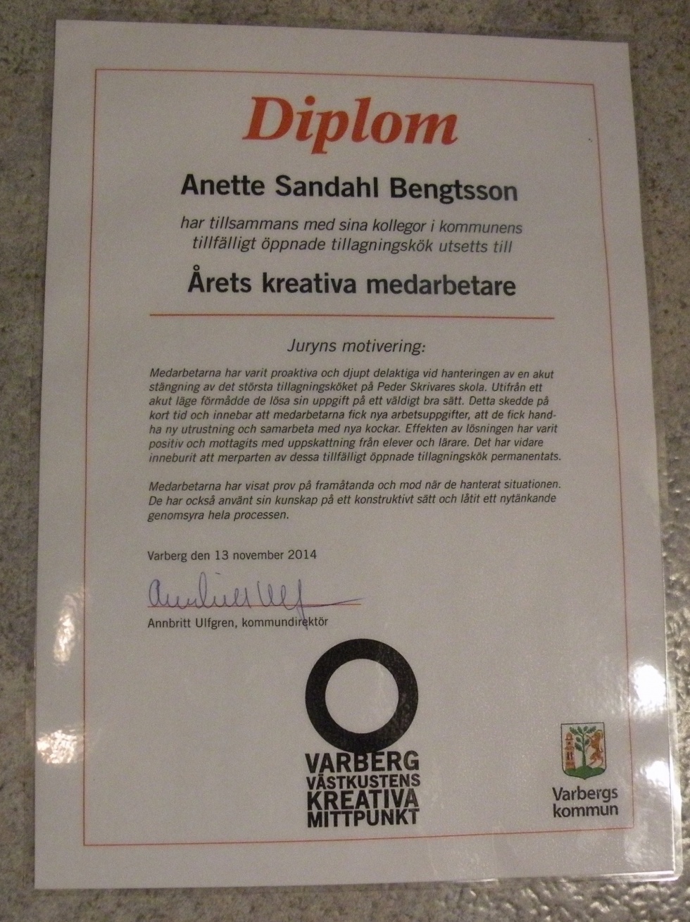 Vi fick faktiskt mycket cred för att vi rodde det hela iland på ett föredömligt sätt och det är bara att gratulera oss alla till utmärkelsen och att gratulera Varbergs Kommun till att de har så många duktiga, kompetenta och dedicerade medarbetare! Utan engagemang och lust till maten, till ungdomarnas och till barnens bästa så skulle det aldrig ha gått! Men vi gjorde det!