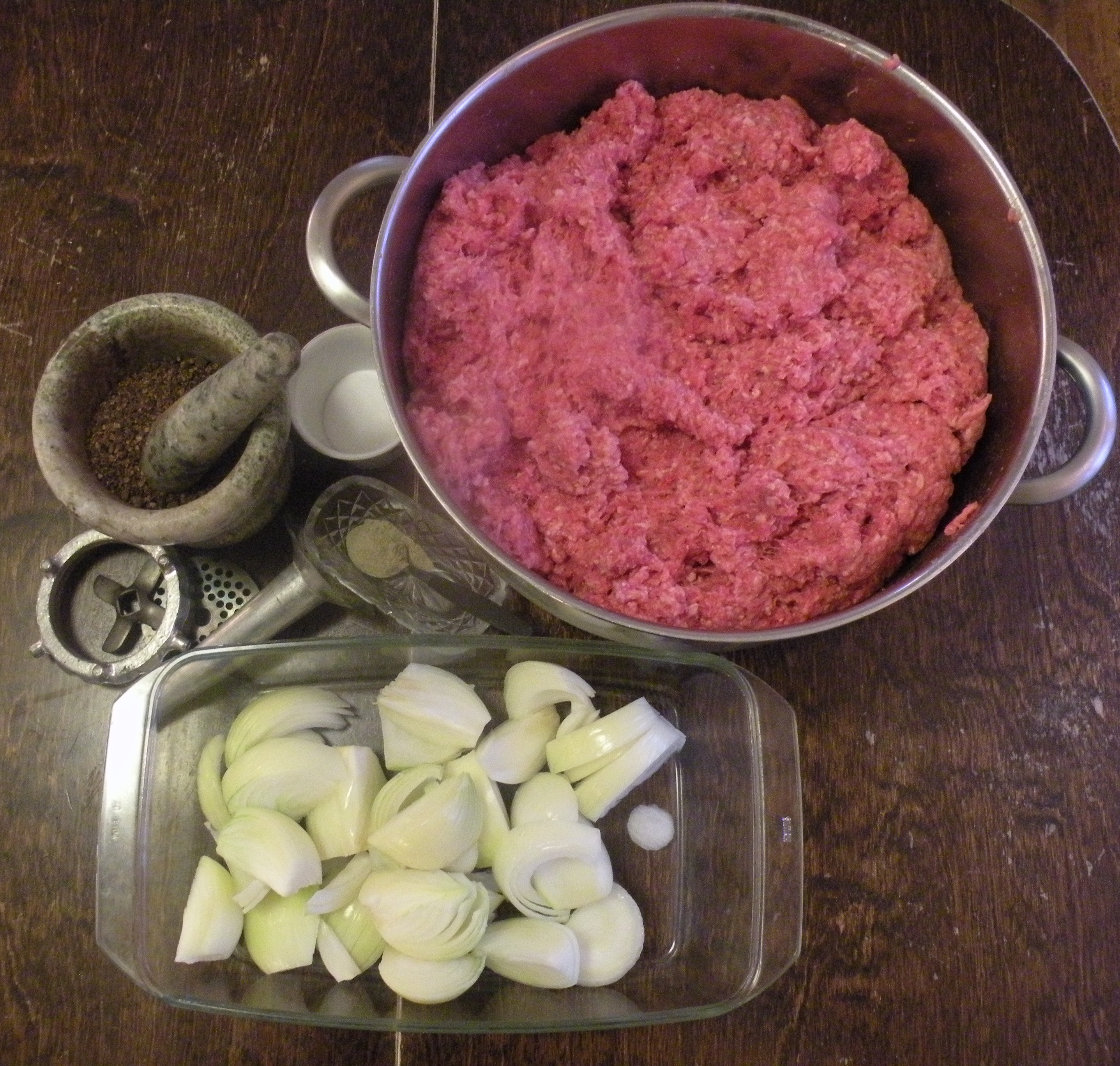 - 4 stora gula lökar maler vi i köttkvarnen och blandar i färsen