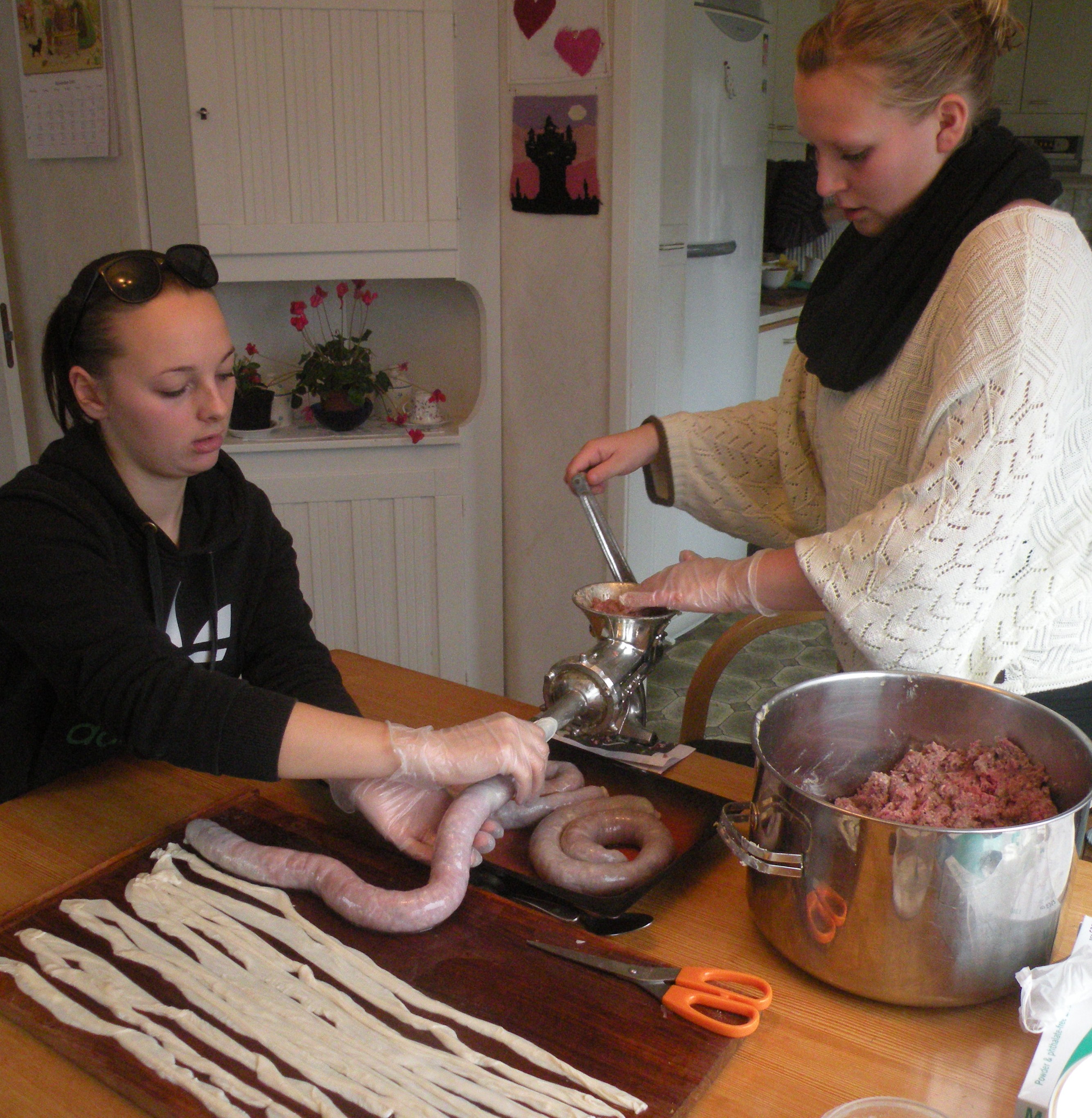 Man får vara två personer annars blir det lite knepigt. Det kan kännas lite ovant i början men man kommer snart in i det. Det är roligt att göra korv fast det är lite meck och pyssel. Så är det när att hantverk ska utföras.