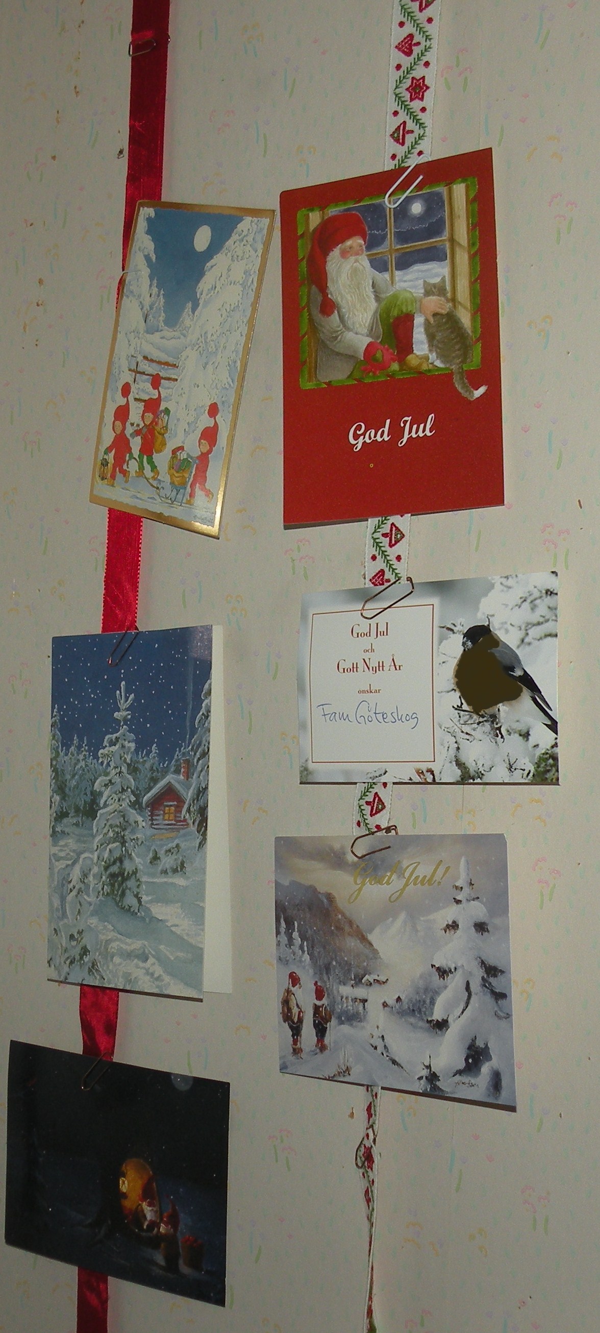 Jag hänger upp fina men enkla band på en vägg och sätter dit korten med ett gem. Då blir julkorten en prydnad som jag kan njuta av hela julen, och njuta av att vi faktiskt har vänner och släkt som gjort jobbet för att vi ska få deras hälsning om en god jul! Det är värt något go’vänner! (Nu lät jag lite som Ernst, jag vet! Men jag gillar Ernst 🙂