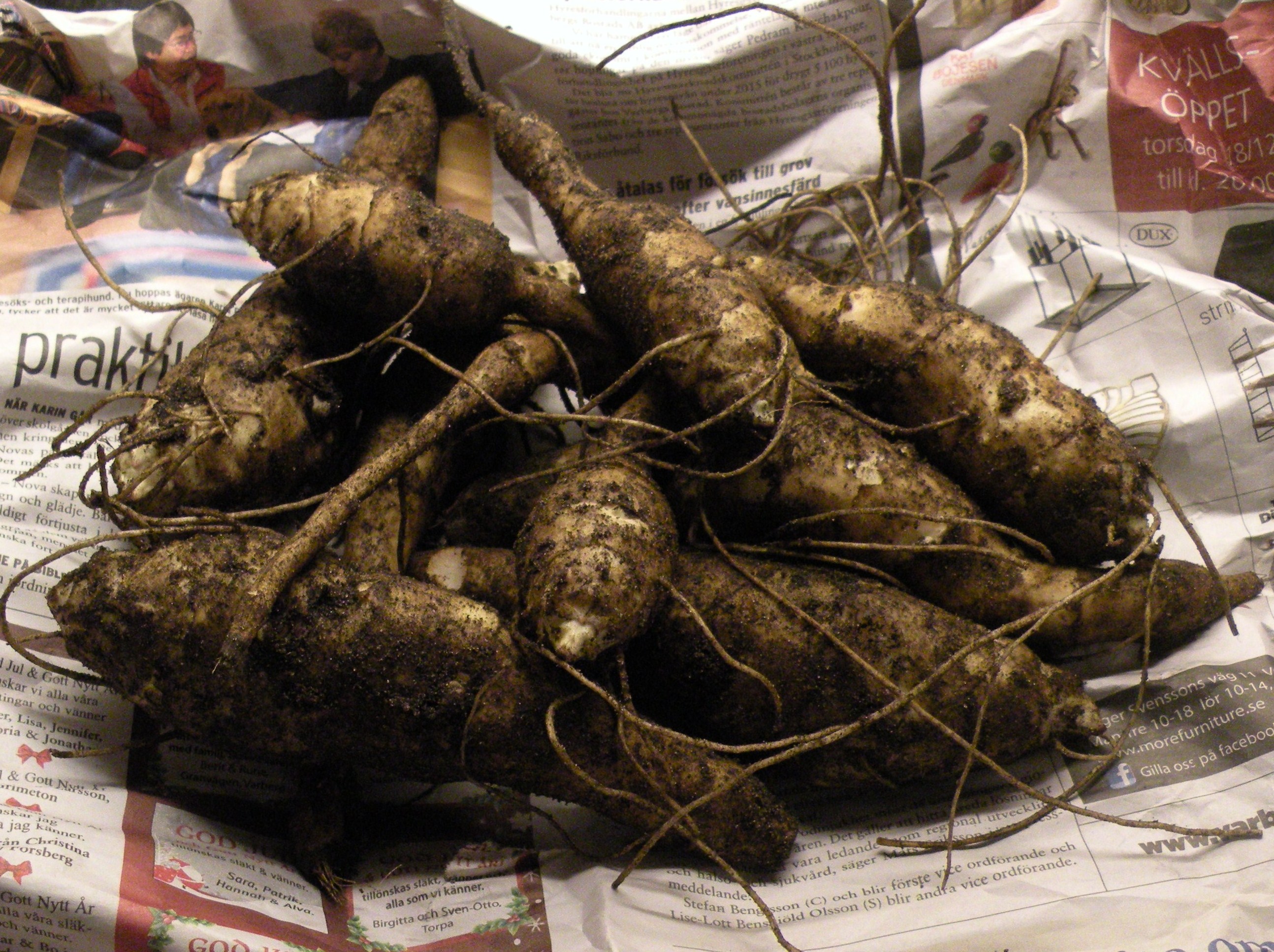 Jordärtskockan har inte mycket med julen att göra traditionellt sett men borde kanske ha det eftersom den kan skördas så länge det är fritt från tjäle i jorden. Det är det ju ofta här i södra Sverige och dessa skockor fick jag nyskördade strax innan jul! Jordärtskockan är en släkting till solrosen och solen dyrkas ju av oss nordbor men konstigt nog är jordärtskockan en ganska bortglömd rotknöl. Den har en speciell smak men oj, så mycket gott man kan göra av den. På engelska heter de Sunroots.