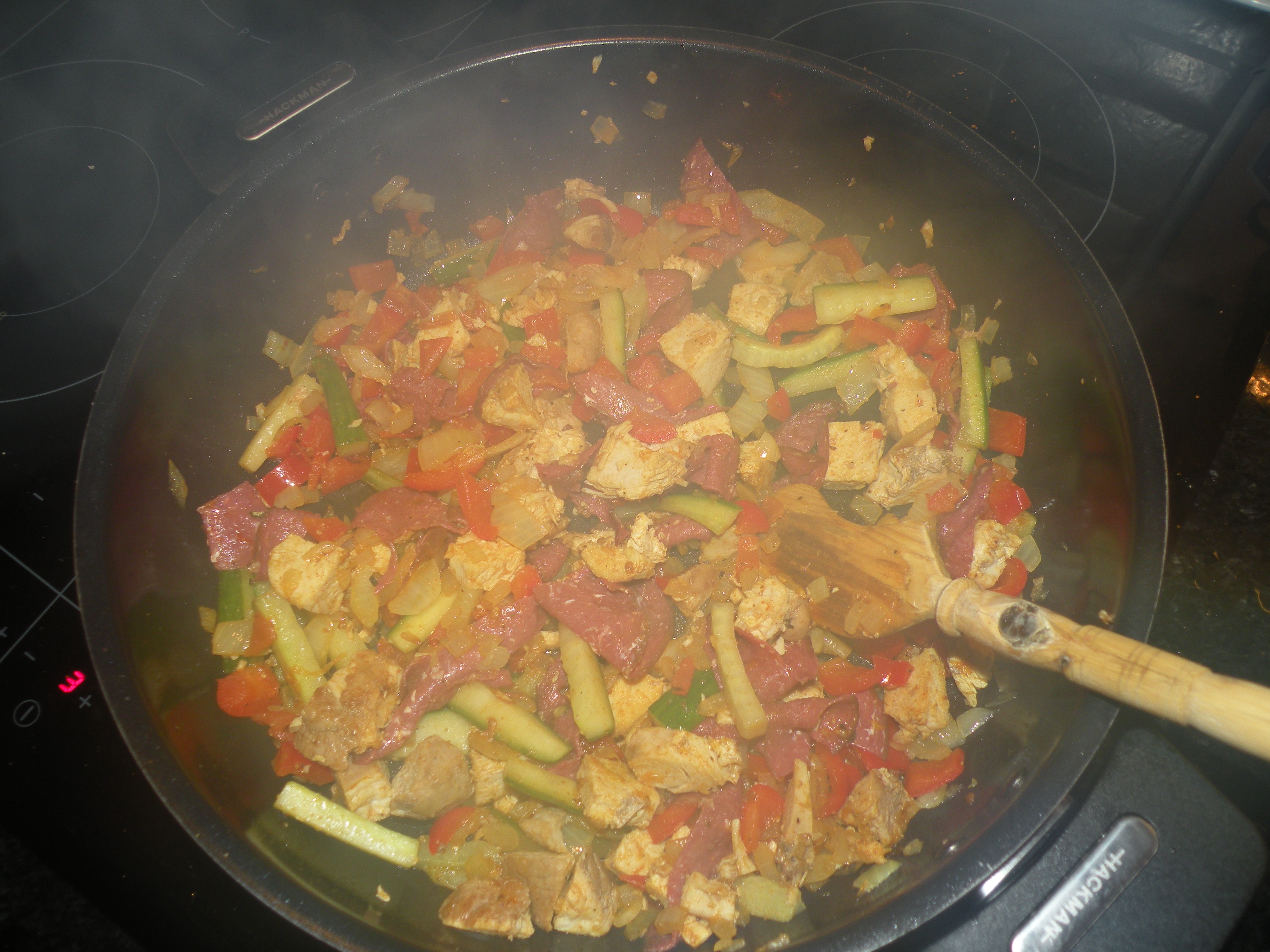 Fräs löken, paprikan och tomaterna i lite smör eller olja. Tillsätt kyckling, salami, gurka och pasta och låt allt fräsa med en stund så det blir varmt. Krydda och lägg över i en ugnsfast form.Sen är det bara att vispa upp äggen lätt och blanda i creme fraishe, mjölk, tomatpuré, salt och kryddor. In i ugnen i 200 grader i knappt en halvtimma så är det klart att servera till exempel med en god och fräsch sallad.