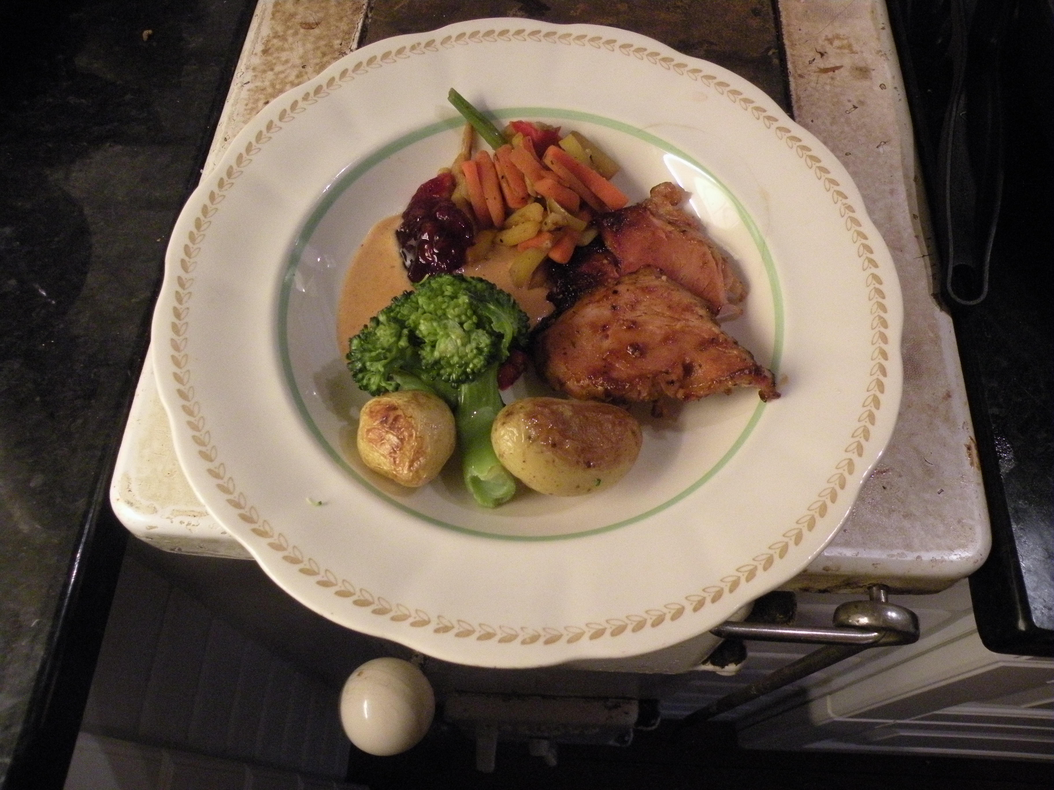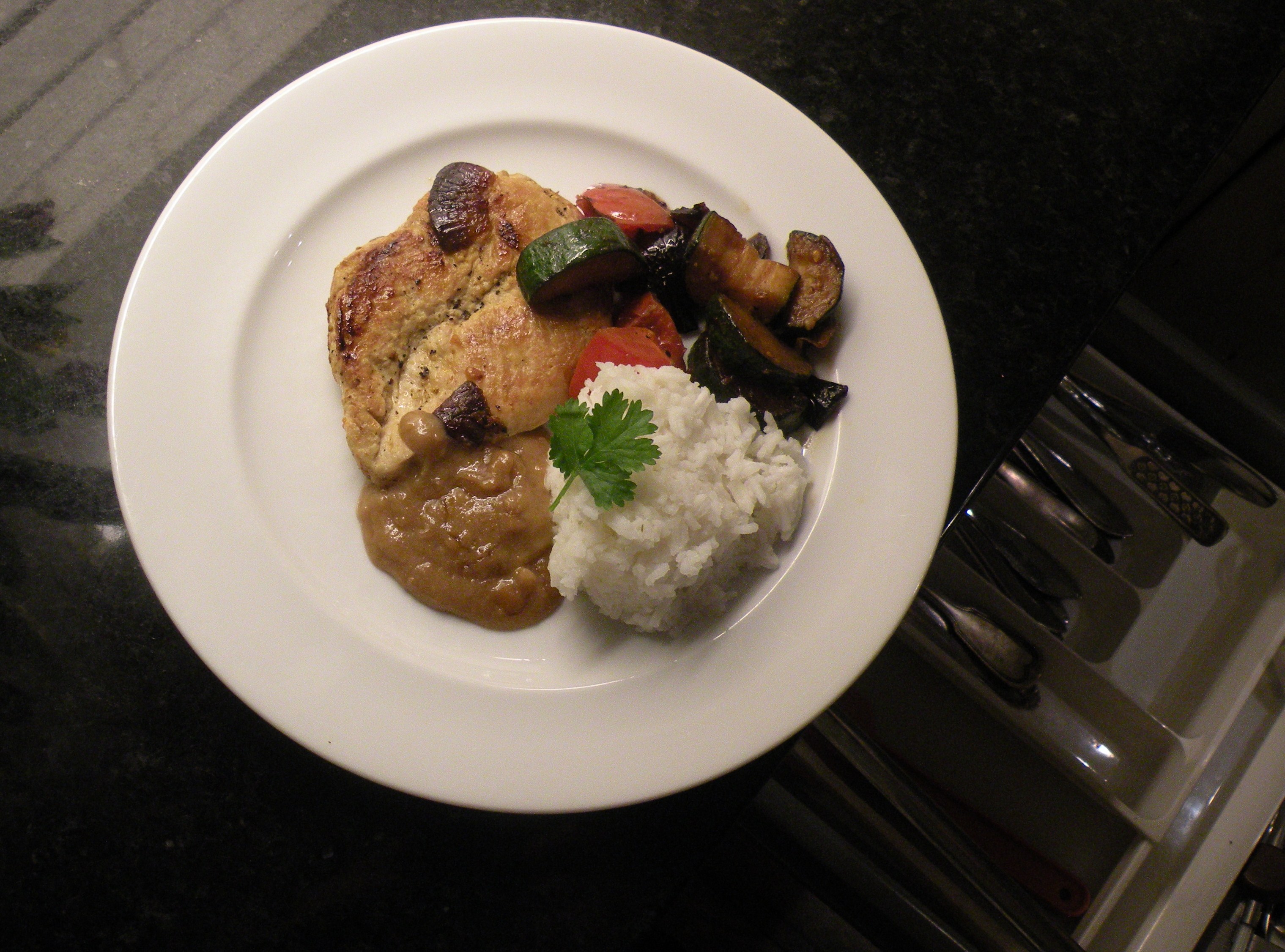 Till sist, denna speciella dag, så lagade vi till en kycklingrätt med jordnötssås. Vi var inte eniga om hurupass perfekt den där jordnötssåsen egentligen var. Enligt jordnötssåsproffset Sanna i familjen så finns det mycket övrigt kvar att önska. Själv tyckte jag att den var helt okey men hur långt räcker det på en skala? Fortsättning följer…vi förfinar den enkla och lättlagade såsen och återkommer med recept.