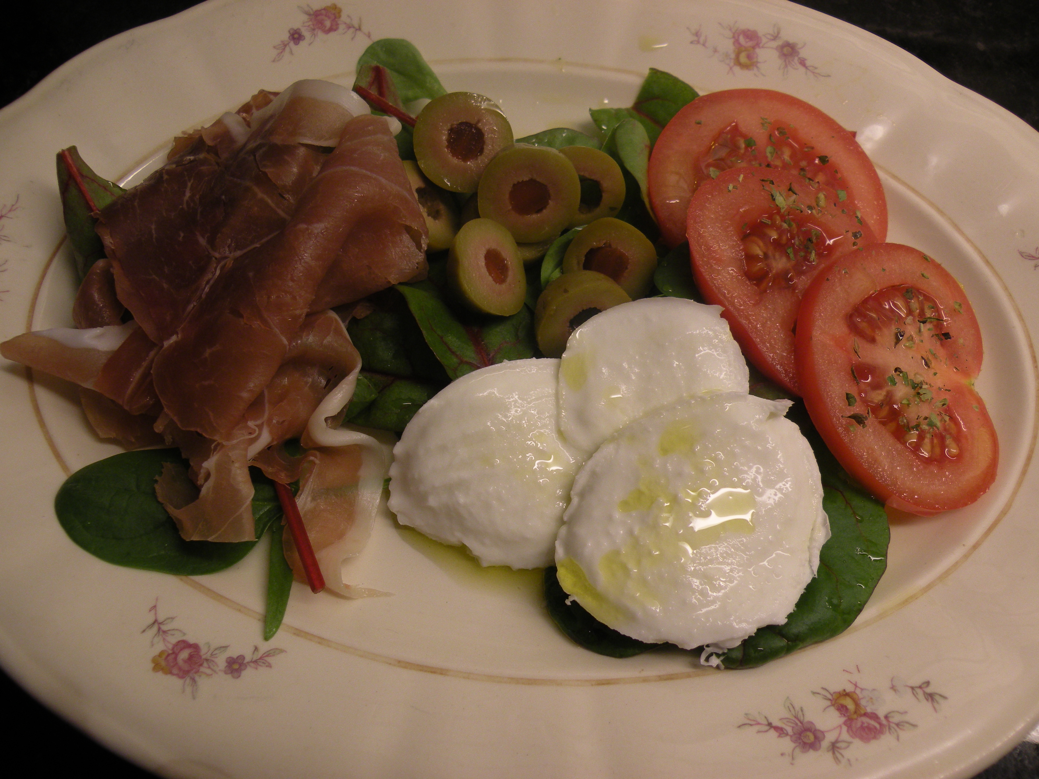 Jag är lite krasslig och hängig och har spenderat dagen i vilans tecken. Då är det skönt att bara kunna öppna lite förpackningar och ändå få en god och nyttig måltid. Jag hade lite av Italien i kylen, nämligen buffelmozarella, prosciutto crudo som är en lufttorkad skinka, några goda oliver och sallad. I skafferiet fanns en flaska olivolja med basilikasmak och örtkryddor. Detta blev en riktigt bra kombo med minimal arbetsinsats.