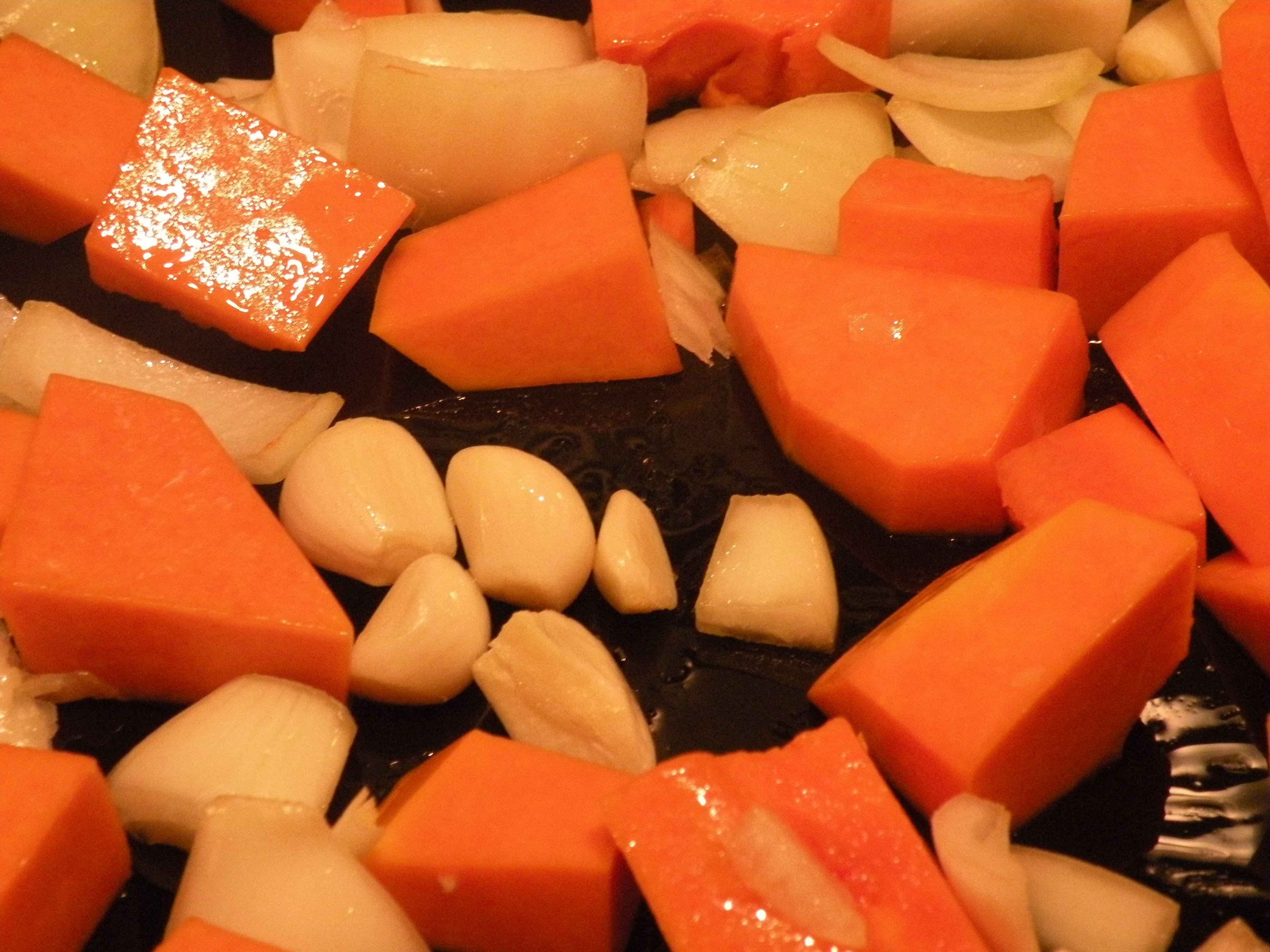 - Skala och skär pumpa och lök i tärningar och lägg på en långpanna.
