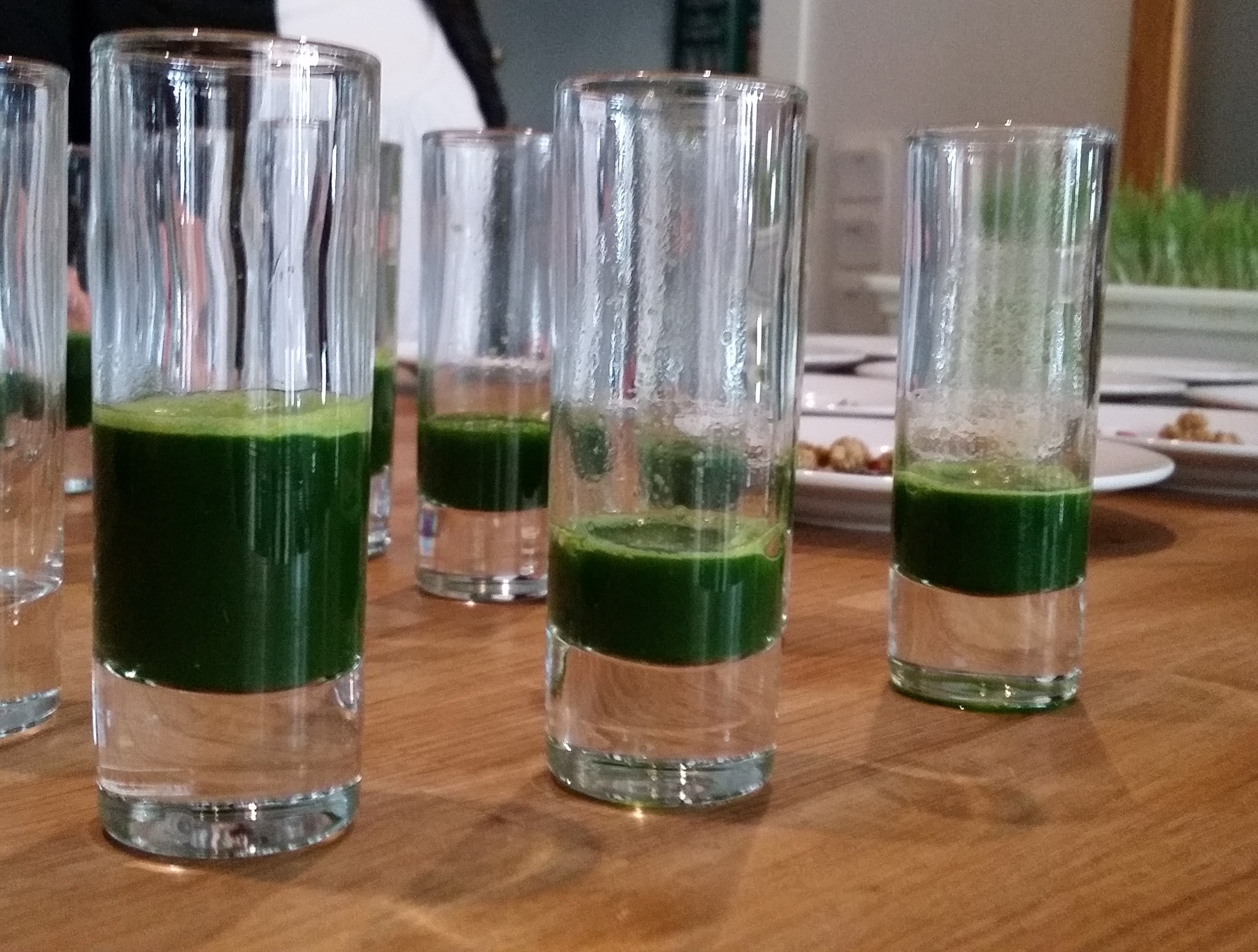 I pausen fick vi sen smaka på vetegräsjuice som Linda tillredde framför våra ögon. Hon hade sått vetegräs i en balja och nu malde hon ner gräset i en råsaftcentrifug och så fick vi varsin näringsladdad shot.
