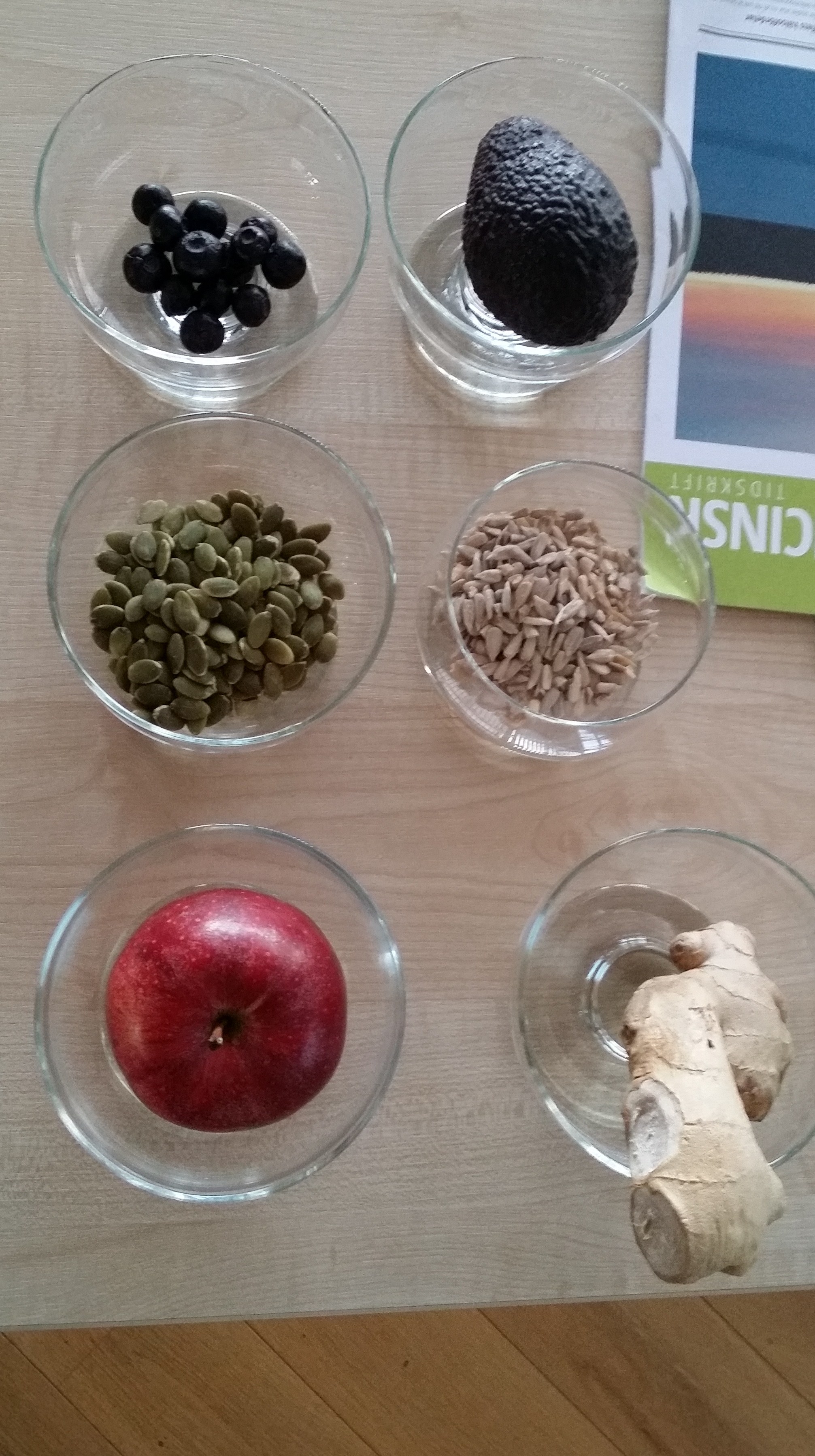 För att visa på hur det kan se ut en vanlig dag hemma och vad vi kan boosta våra kroppar med så hade Linda ställt fram små skålar med nyttigheter – blåbär, avokado, pumpakärnor, solrosfrön, äpple och ingefära. Hon hade också en god choklad som man kunde köpa med sig hem. Ekologisk, fairtrade, vegan, raw choklad från Equador. Jag köpte en kaka med smak av blåbär och en med havssalt och kakaonibs. Jättegoda! De var ganska dyra, två små kakor kostade 100 kronor men det var det värt.