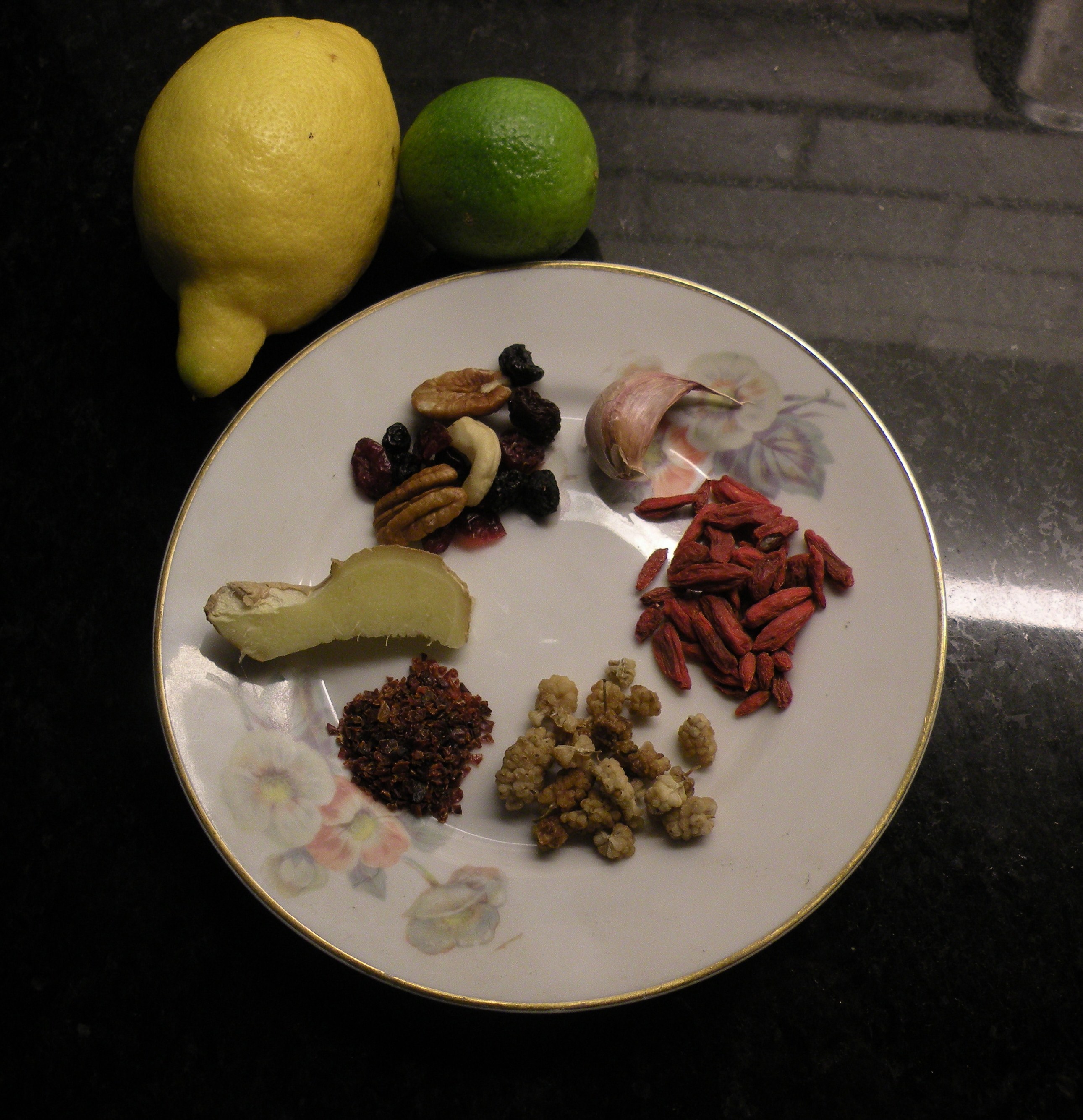 På det fina fatet från Karlskrona Porslin ligger det en nöt- och bärblandning med tranbär, blåbär, russin, pekan- och cashewnötter sen vitlök, gojibär, mullbär, torkade nypon och ingefära. Citron och lime behöver väl ingen närmare presentation.
