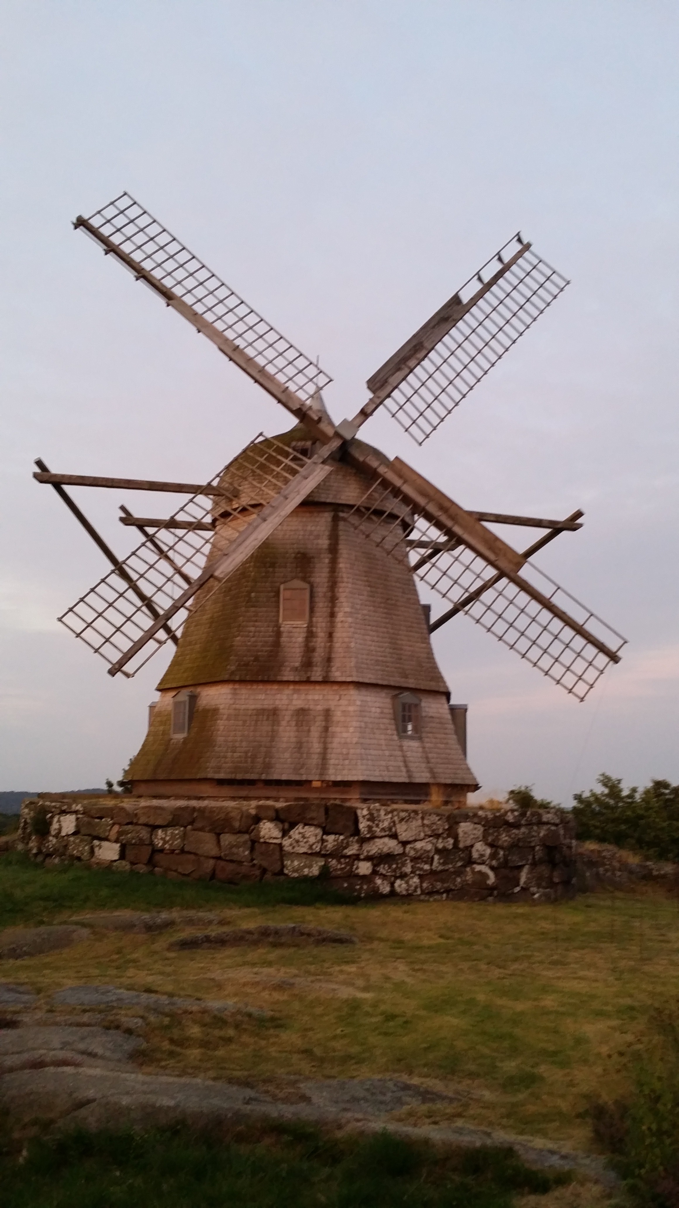 Vi hade tänkt att bevittna Götheborgs avgång från Varberg från första parkett vid väderkvarnen i Norra Näs men det hann bli mörkt så vi fick nöja oss med att beskåda den varsamt renoverade gamla kvarnen på Kvarnaberget. Det är inte illa det heller en fin sommarkväll som denna.