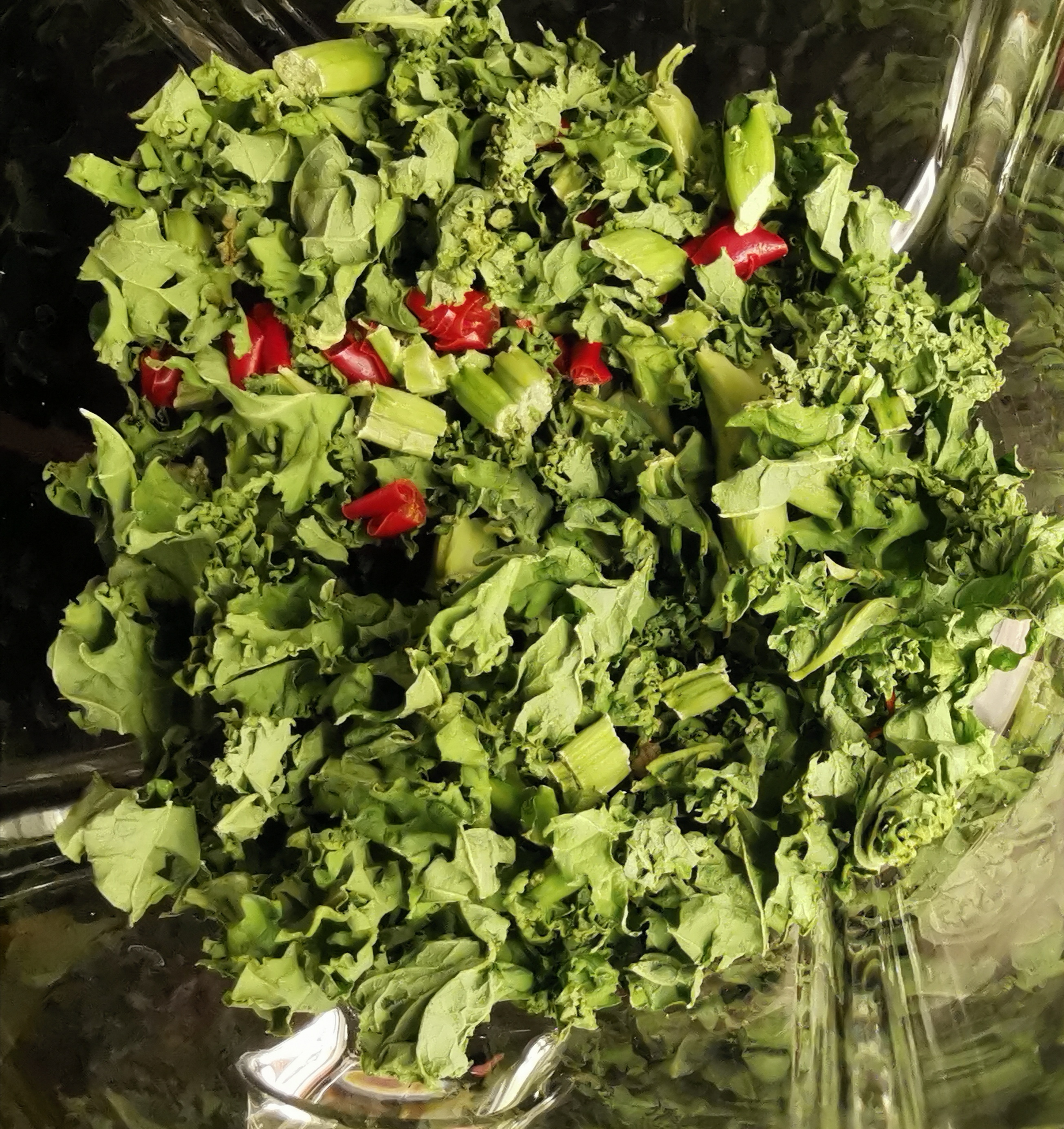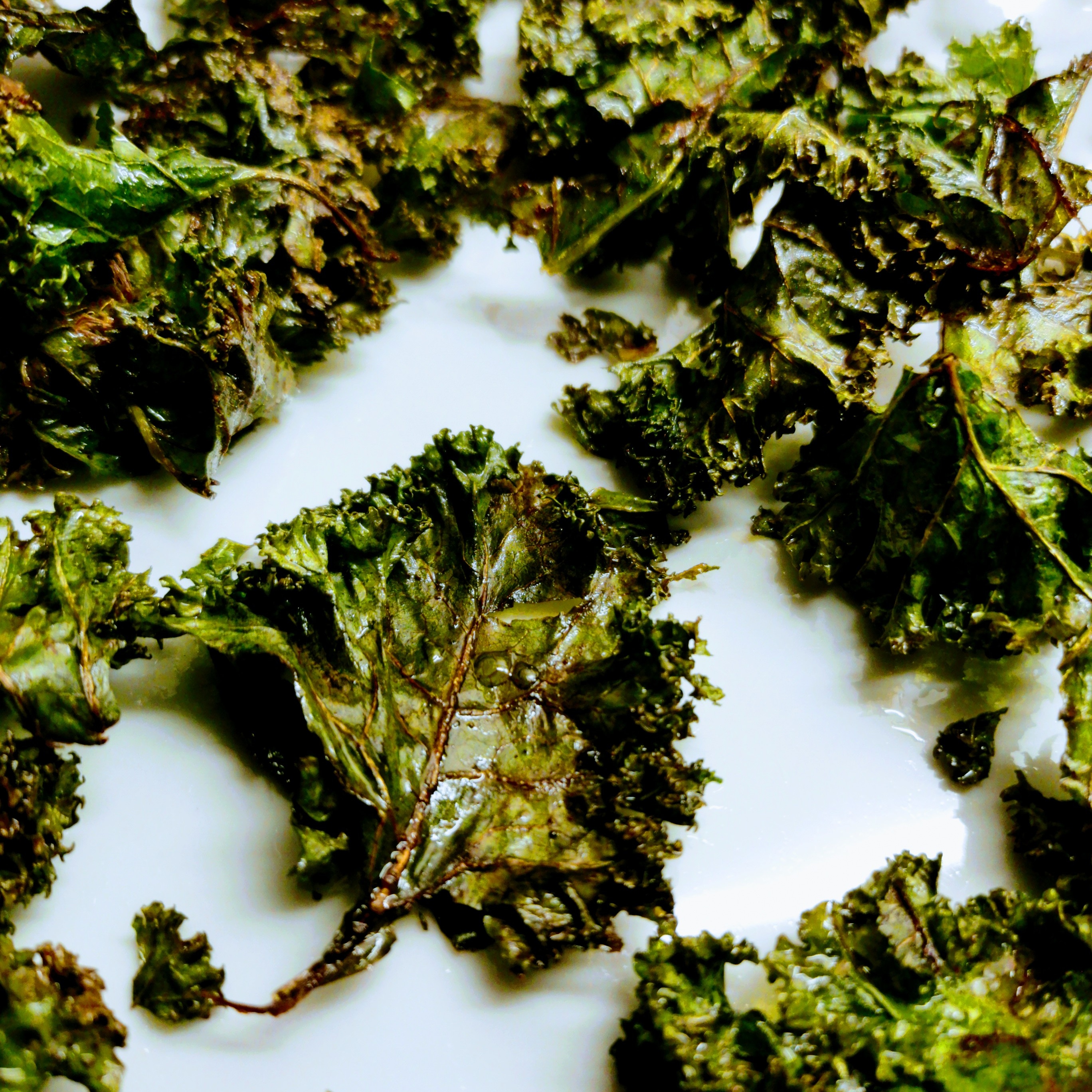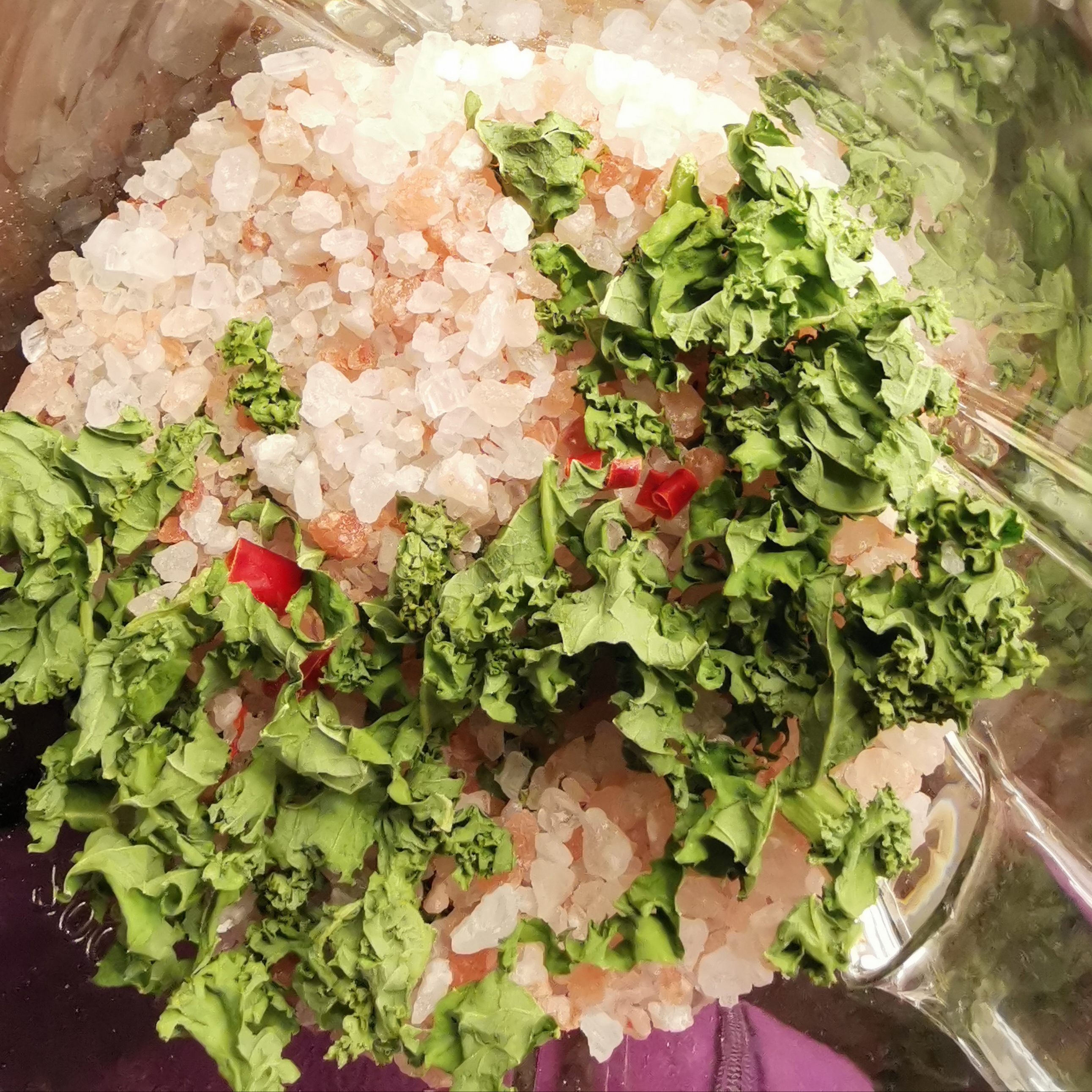 Ringla lite olja och honung över grönkålsbitarna. Strö över kryddorna och massera ihop allt. Bred ut på en plåt och kör i ugnen tills de är frasiga. Strö över lite salt.