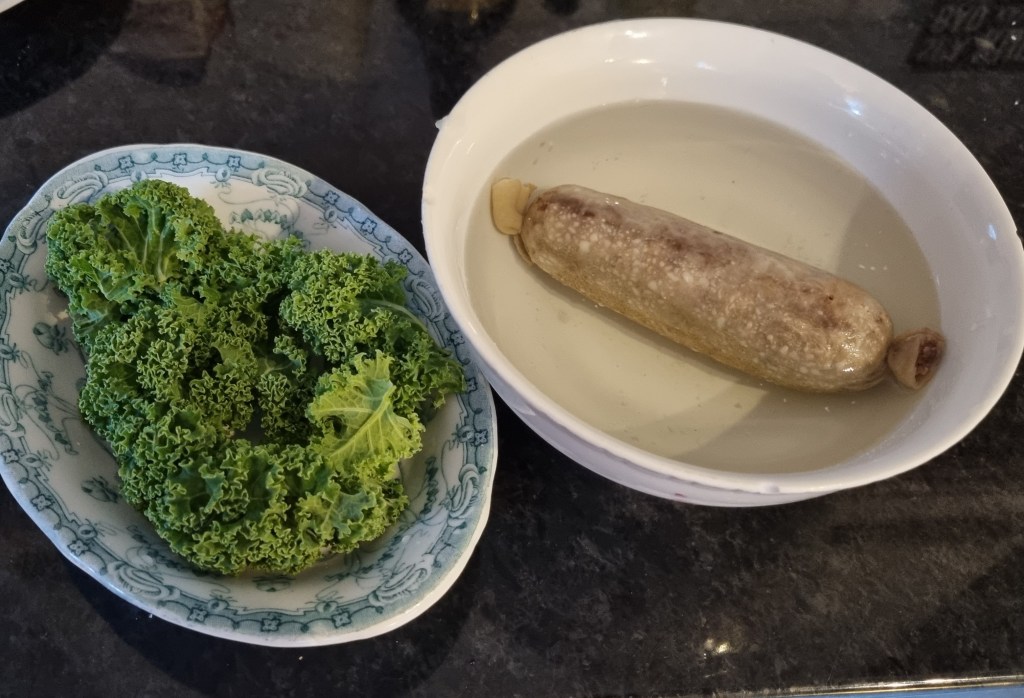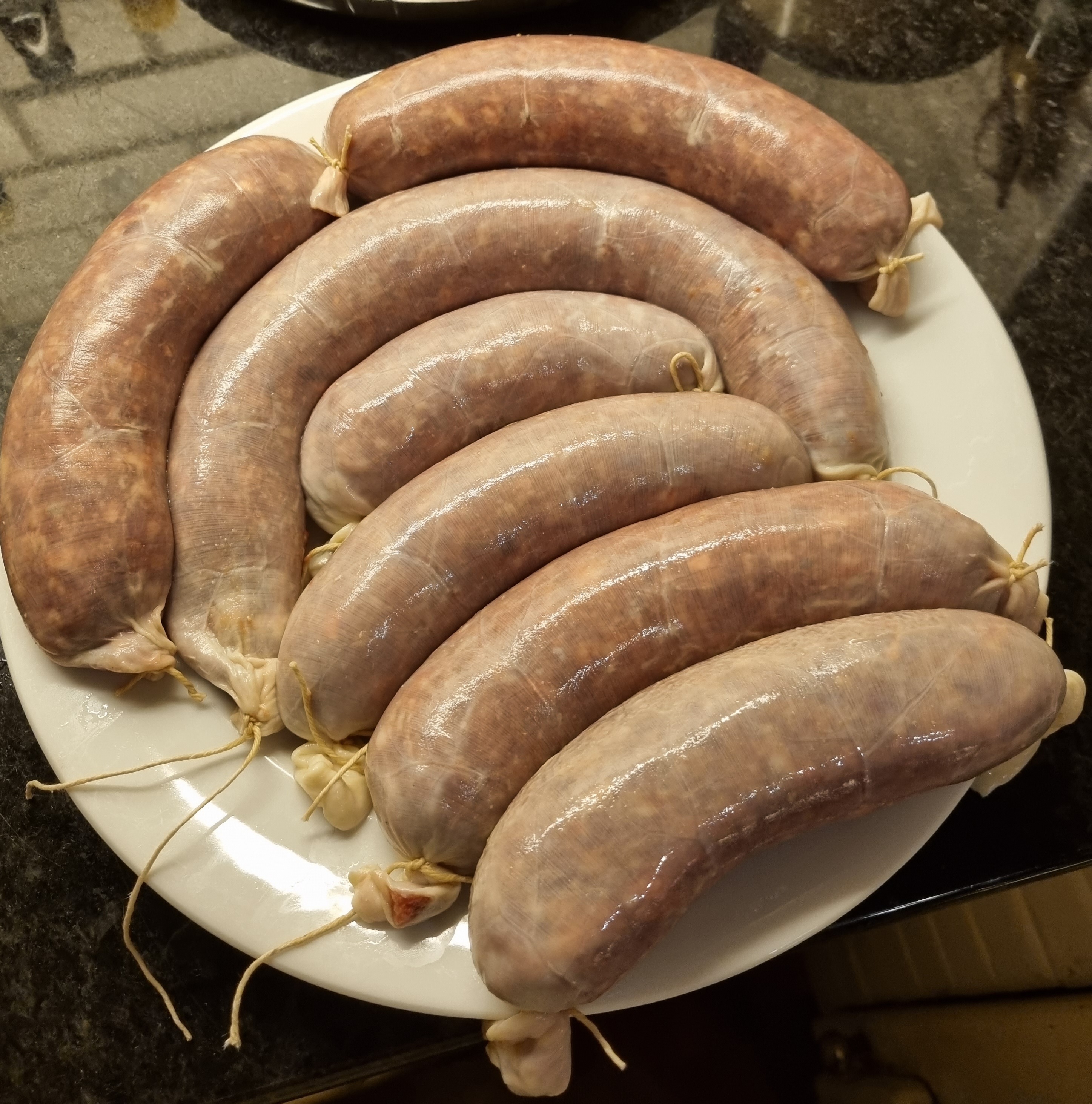 Vi gjorde några ganska knubbiga och korta korvar och några längre. Det är en smaksak hur man vill göra med det. Glöm bara inte att knyta hushållssnöre runt varje ände på korven för annars flyter färsen ut i kokvattnet.