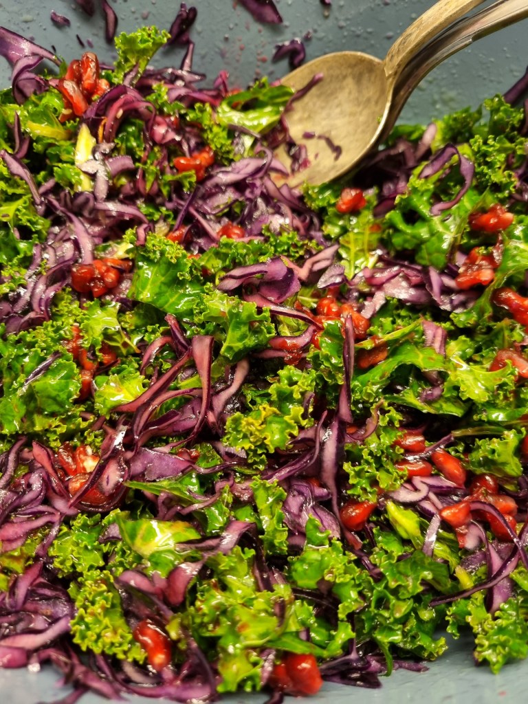 Jag tycker att grönkålen kan vara lite sträv att äta helt obearbetad så jag brukar ringla lite olja över, strö på en nypa salt och och massera in dem i kålen. Sen kan du välja bland många goda ingredienser till din sallad, till exempel citrusfrukter, tranbär, äpple, russin och mycket mer. Toppa gärna salladen med pumpafrön och solrosfrön.