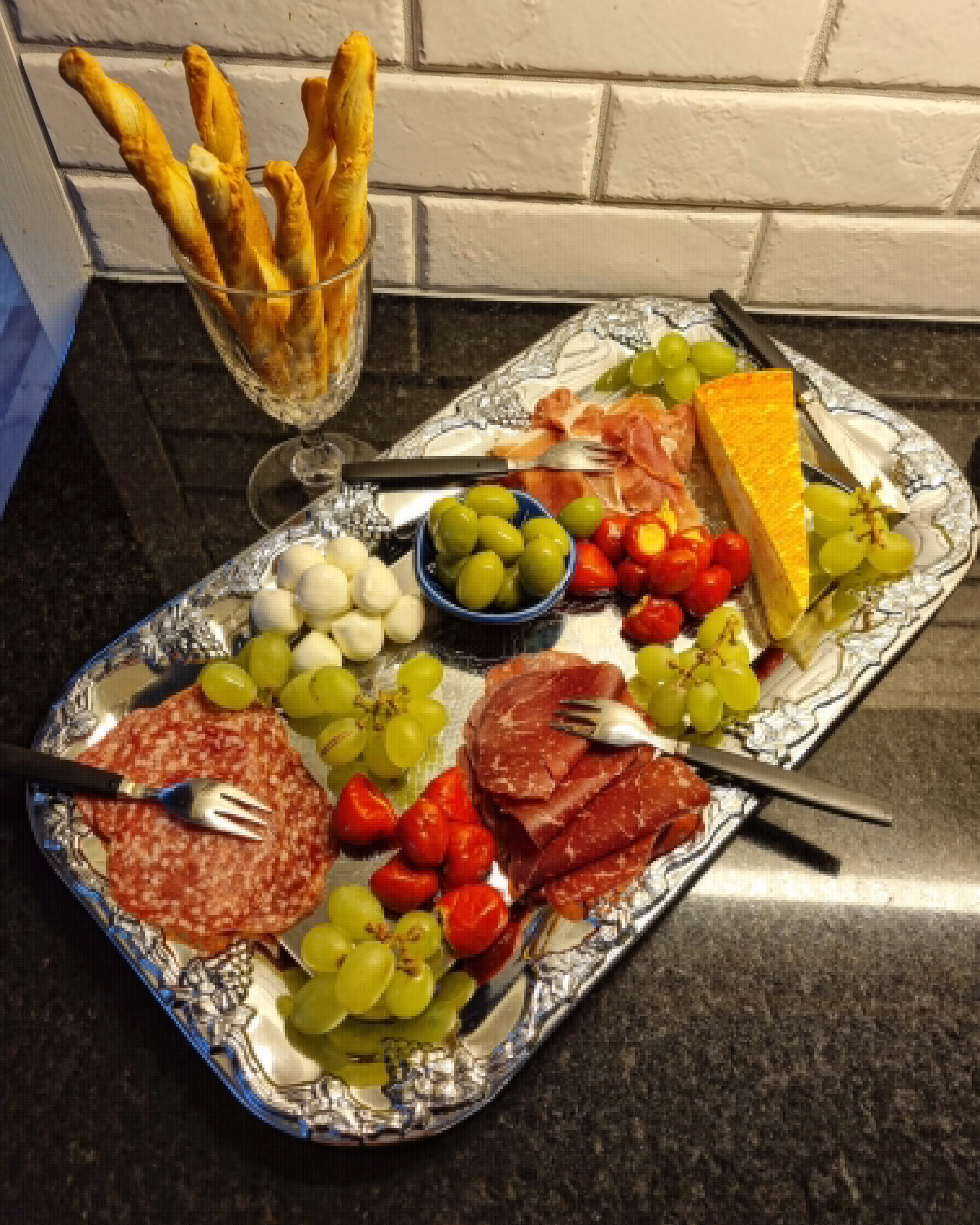 En förrätt eller starter som inte kräver mycket jobb alls men som alltid uppskattas – en snygg och läcker delikatessbricka! Välj ut dina favoriter bland delikatesserna i butiken och lägg upp på fina brickor. Här hade jag köpt en salami, en skinka, en ost, mozzarellabollar, smakrika småpaprikor med fyllning, oliver, druvor och oststänger. Lite bubbel till det så kan festen börja!