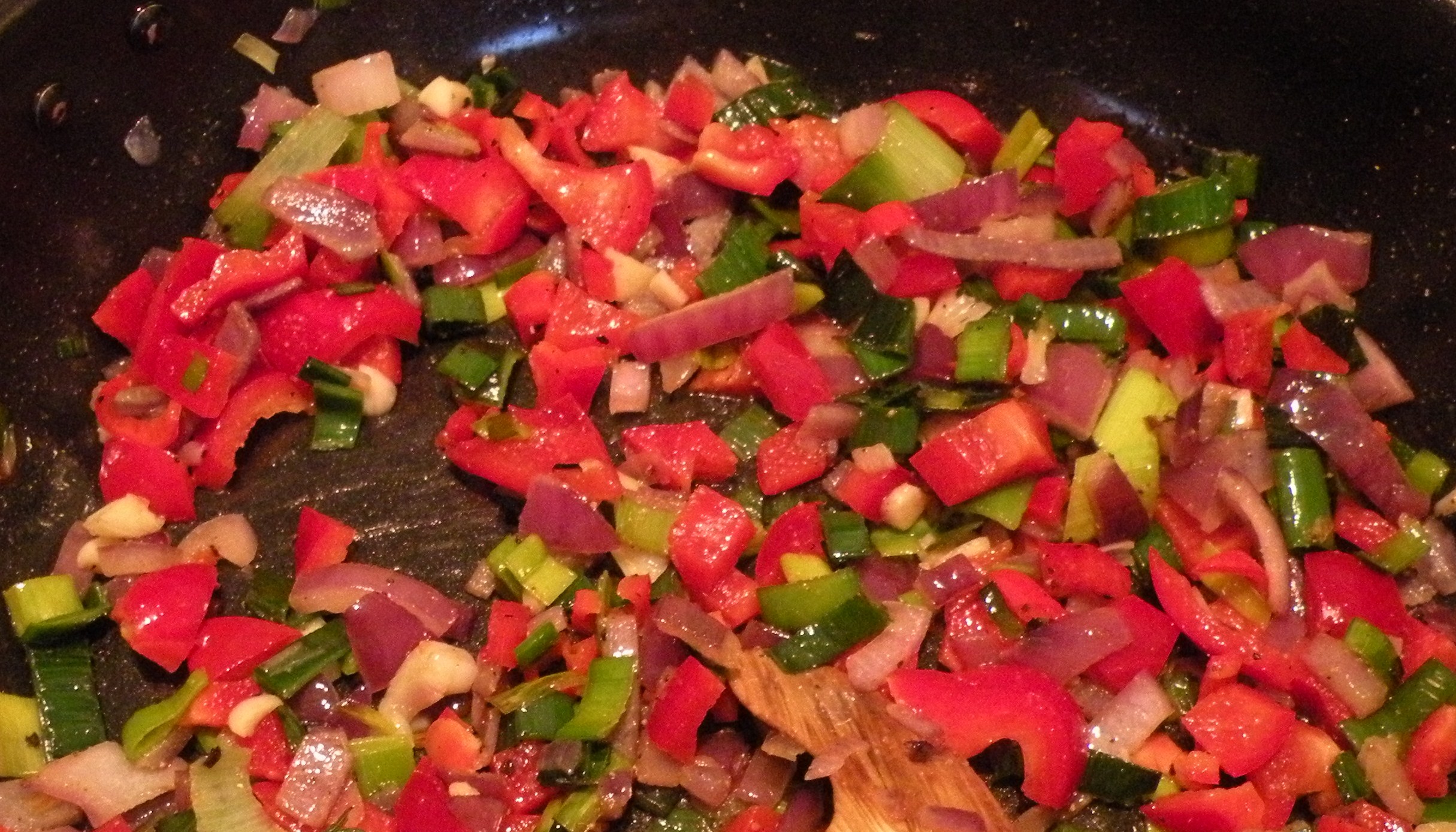- Fräs grönsakerna i lite smör tills vattnet i svampen kokat bort, salta lätt och lägg dem på kycklingen i formen