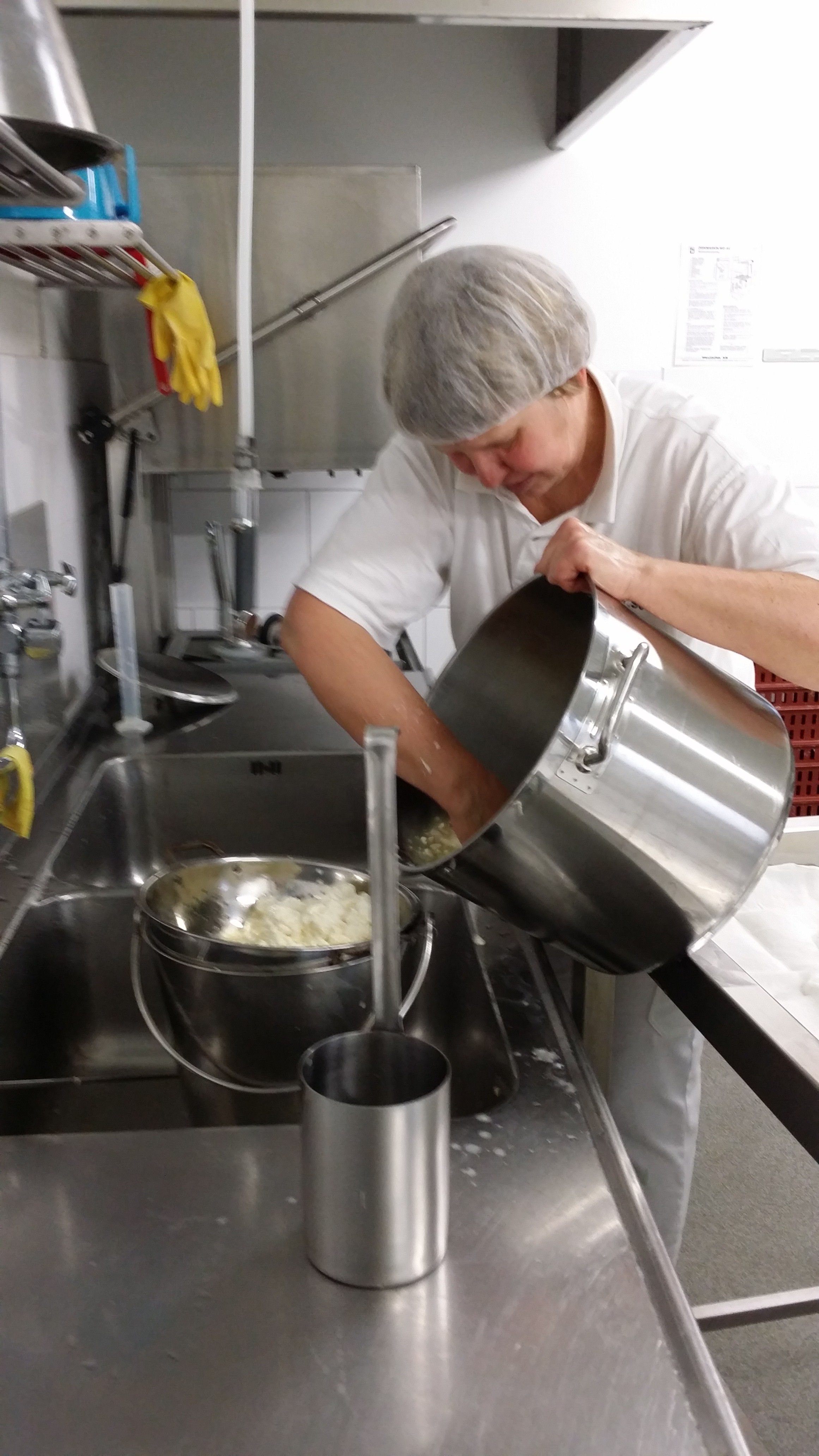 Vasslen hälldes tillbaka i grytan och ställdes åter på spisen medan den gryniga massan lindades in i linnetyg och Monica pressade ut så mycket som möjligt av vätskan som var kvar. Sen fick den stå på en lätt lutande bänk för att rinna av.