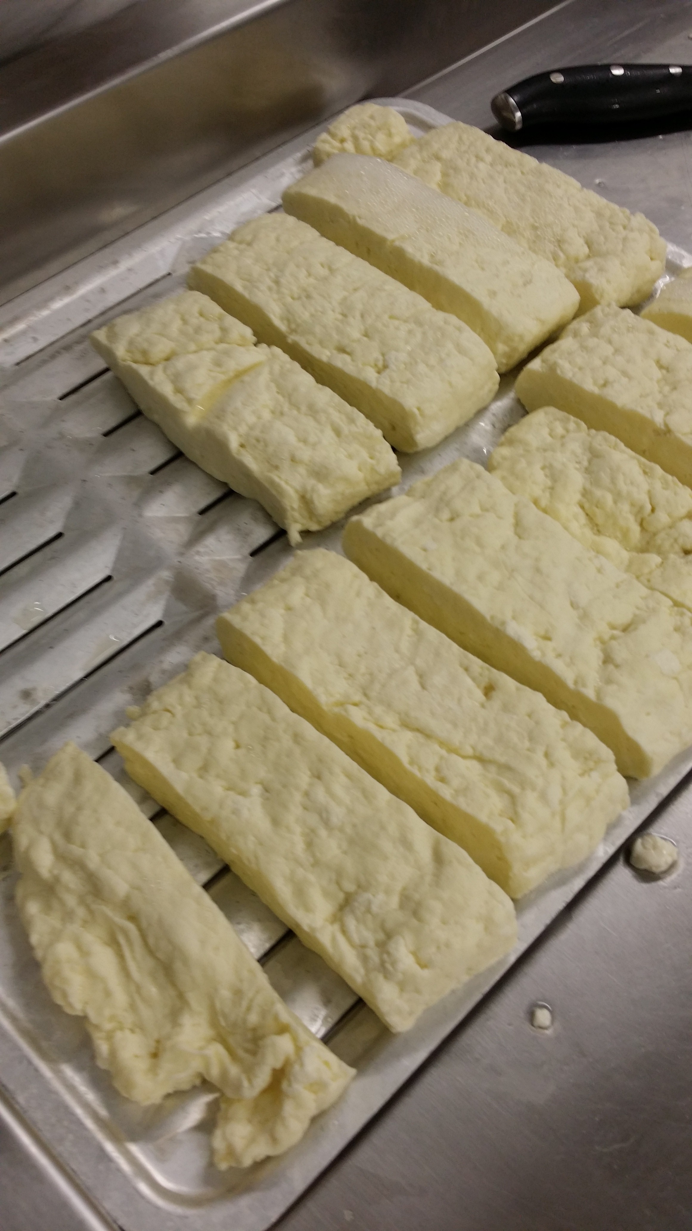 I morgon kommer beskrivningen av Bondostens tillkommande men idag ska jag berätta om en annan ost som också fick se dagens ljus igår, nämligen Båtakåsen som är en grillost av halloumityp fast gjord av komjölk och mindre salt. I en 24-litersgryta på spisen hade en annan pastörisering ägt rum och den ostmassan hälldes så småningom av och separerades från vasslen i grytan.