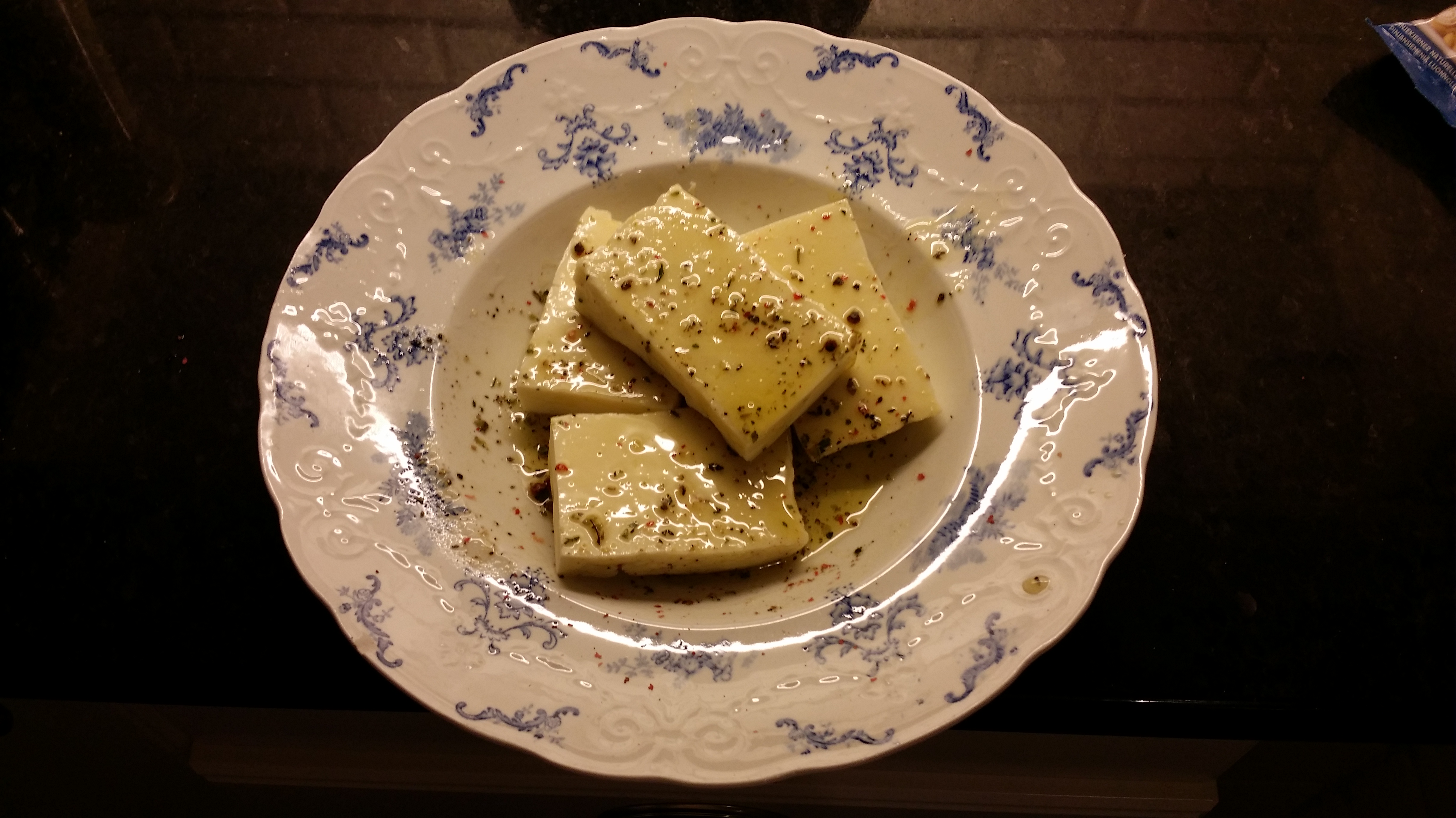 Några skivor av grillost fick åka med mig hem. Jag har marinerat en av ostarna i en marinad bestående av olivolja, honung, salt, svartpeppar, franska örter, rosépeppar och lite pressad lime. De andra stekte jag naturella i het stekpanna med lite smör.