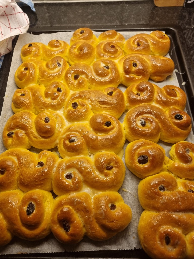 Jag skulle baka saffransbullar förra veckan och googlade runt efter ett bra recept. Jag fann några bullar som var bakade med fördeg, vilket jag aldrig provat innan men säkert kommer att göra igen. Dessa bullar blev jättegoda och saftiga! Receptet är konditor Magnus Johanssons, sök på köket.se om du vill ha hans exakta recept. Han mortlar saffran med lite socker och låter det marinera i en skvätt konjak en stund.