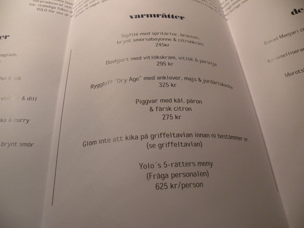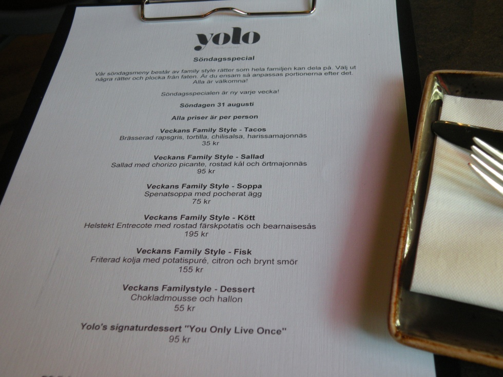 Jag kanske ska tillägga att det är en landslagskock som är köksmästare på Yolo, nämligen Jonas Lagerström och kreativ ledare är Jonas Lundgren. Han är en meriterad kock som bland annat har kommit tvåa i världsmästarmatlagningens Bocuse d’Or och har många andra strängar på sin lyra. Ingen av dem jobbade denna söndag men de kan sannerligen vara lediga i lugn och ro en dag och lämna sin restaurang i goda händer till den kunniga personalen på Yolo.