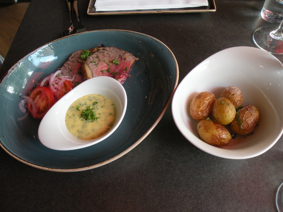 Henrik beställde en rätt med entrecôte, en klassisk bearnaisessås, rostade färskpotatisar och en fräsch tomatsallad.