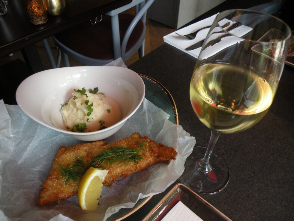Man skulle ju kunna tro att detta skulle vara en tung och bastant rätt men icke. Visst, fisken var friterad men friteringen var lätt och krispig och koljan var fräsch. Purén var lätt, luftig och mild. Jag ville ha ett vin till fisken och bad vår servitör att ta in ett vin som passade och det blev en riesling. Jag gillar vin, jag tycker att det är roligt med smaker, kombinationer och sensationer även där men jag är ingen vinkännare. Detta vinet var jättegott och gav rätten ännu en höjning. Dessutom hade det en temperatur som jag tycket var perfekt. Svalt och skönt!