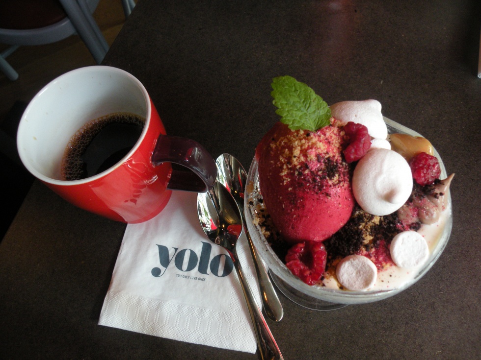 You Only Live Once. Desserten säger allt. Detta är den roligaste, knasigaste och en av de godaste desserter jag någonsin har ätit! Den innehåller extra allt. En av kockarna kom ut till oss när vi hade börjat att smaska på vår dessert och frågade oss vad vi tyckte. – Jättegott och spännande, sa vi. -Ja, det är som att man samlat alla barndomsminnen i en enda dessert, sa han. Så sant, kombinationen av gräddig vaniljglass, hallonsorbet, hallon, maränger, kolasås, marschmallows, kaksmulor, choklad och säkert annat som jag glömt, i ett enda vackert glas. Och gott var det! Made my day!