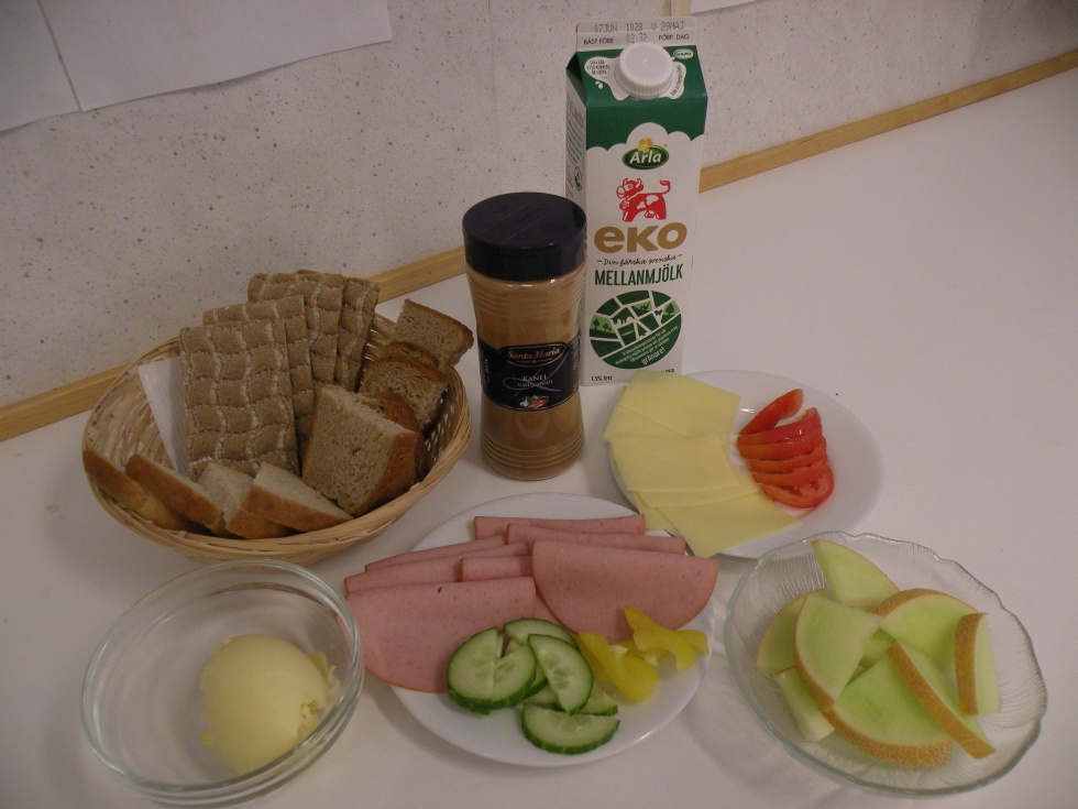 Till gröten serverades det mjölk och kanel. Bröd, smör, ost och något köttpålägg ska finnas på bordet, tycker jag och så ska det tillsättas lite färg i form av grönsaker och helst någon liten bit frukt. Då får barnen en bra start på dagen och både gommen, magen och ögonen får sitt för vi äter ju även med ögonen, eller som min sons kompis uttryckte det; – Det är ögonen som ser maten först. 🙂  Tack för det visdomsordet, Ola