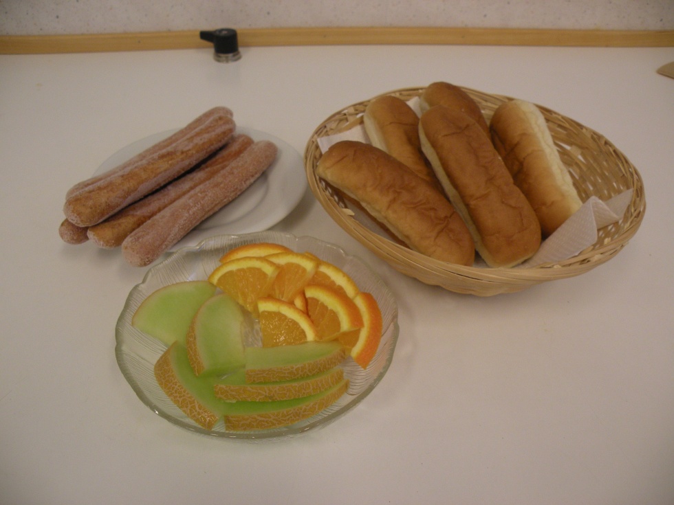 Vi hade mycket frukter på salladsbuffén idag, det fanns en frisk, finhackad fruktsallad med äpplen, apelsiner, banan, lite kiwi, citron, cantaloupe-melon, vattenmelon och inlagd ananas. Den var passande för denna varma dag, gick åt som smör i solsken och var läskande och fräsch, sen hade vi en sallad med tunt skivad gurka, tunt skivade rädisor och lite vattenmelon, den var också riktigt somrig, lätt och krispig. Strimlad isberg och rårivna morötter finns alltid och likaså pizzasallad. Idag hade vi också en vit dressing, inlagd ättiksgurka och kokt brysselkål i helt naturell form.
