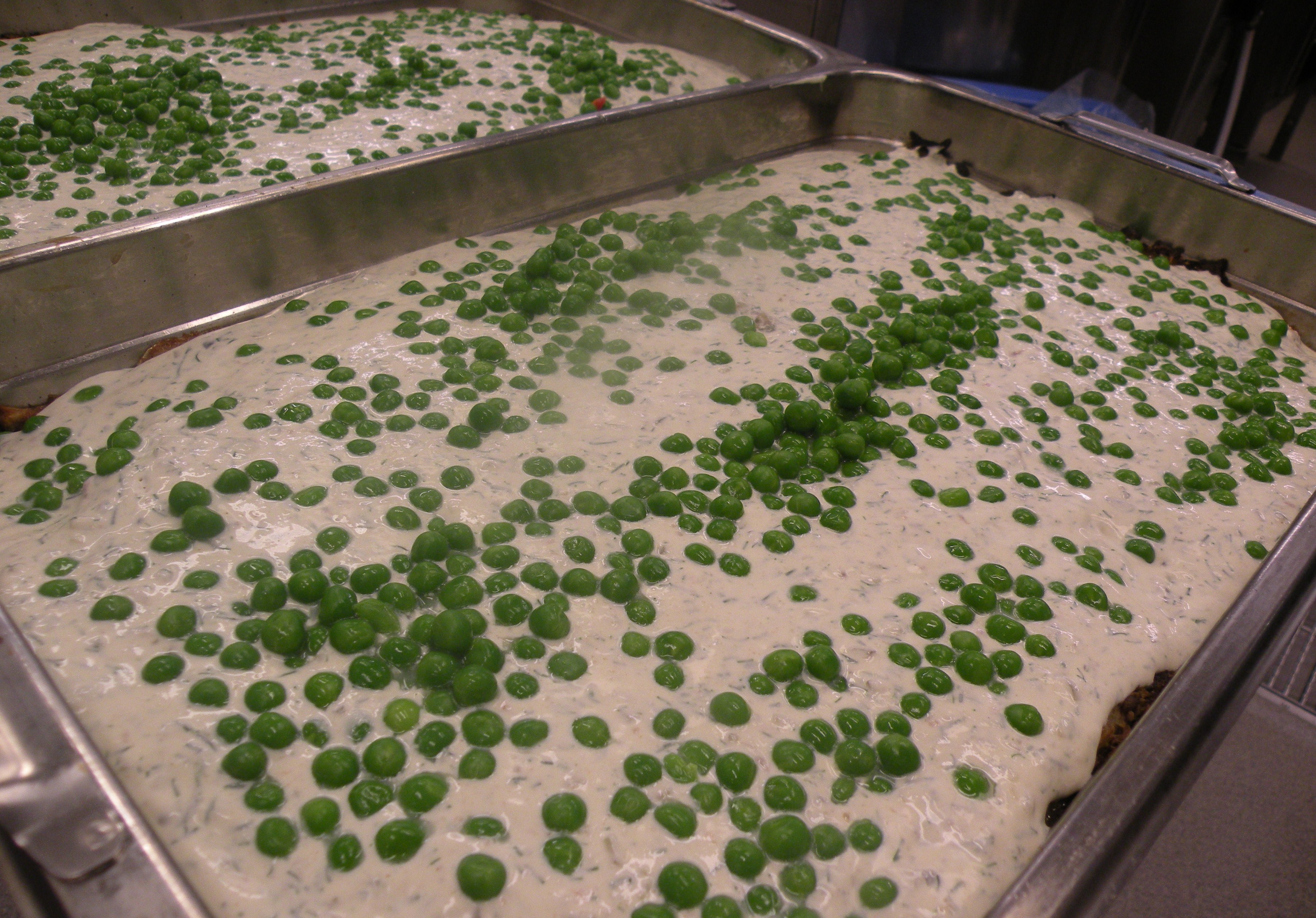 Sen är det bara att breda såsen över den kalla fisken. Jag strödde över kalla, tinade ärtor också för att få lite färg.